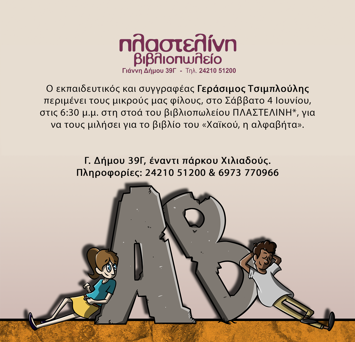Ο εκπαιδευτικός και συγγραφέας Γεράσιμος Τσιμπλούλης μας προσκαλεί όλους, μικρούς και μεγάλους, και κυρίως τους μικρούς του φίλους να συζητήσουν για το βιβλίο του με τίτλο «Χαϊκού η αλφαβήτα», το Σάββατο 4 Ιουνίου στις 6.30 το απόγευμα στο βιβλιοπωλείο Πλαστελίνη, στην οδό Γ. Δήμου 39Γ, έναντι πάρκου Χιλιαδούς.