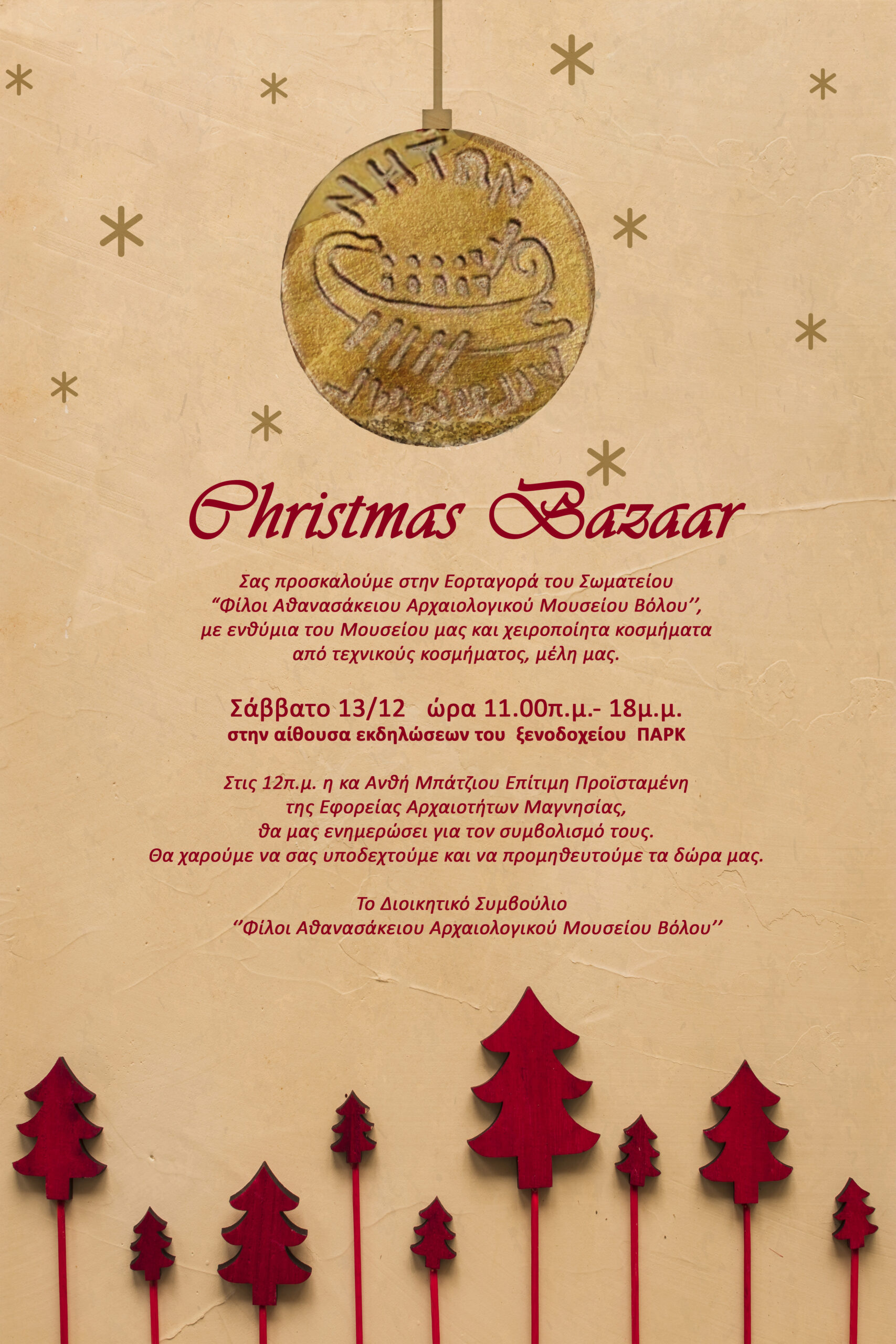 Κατά τη διάρκειά του bazaar και συγκεκριμένα στις 12π.μ. η κα Ανθή Μπάτζιου, Επίτιμη Προϊσταμένη της Εφορείας Αρχαιοτήτων Μαγνησίας, θα προχωρήσει σε ενημέρωση για τον συμβολισμό των ενθυμίων.