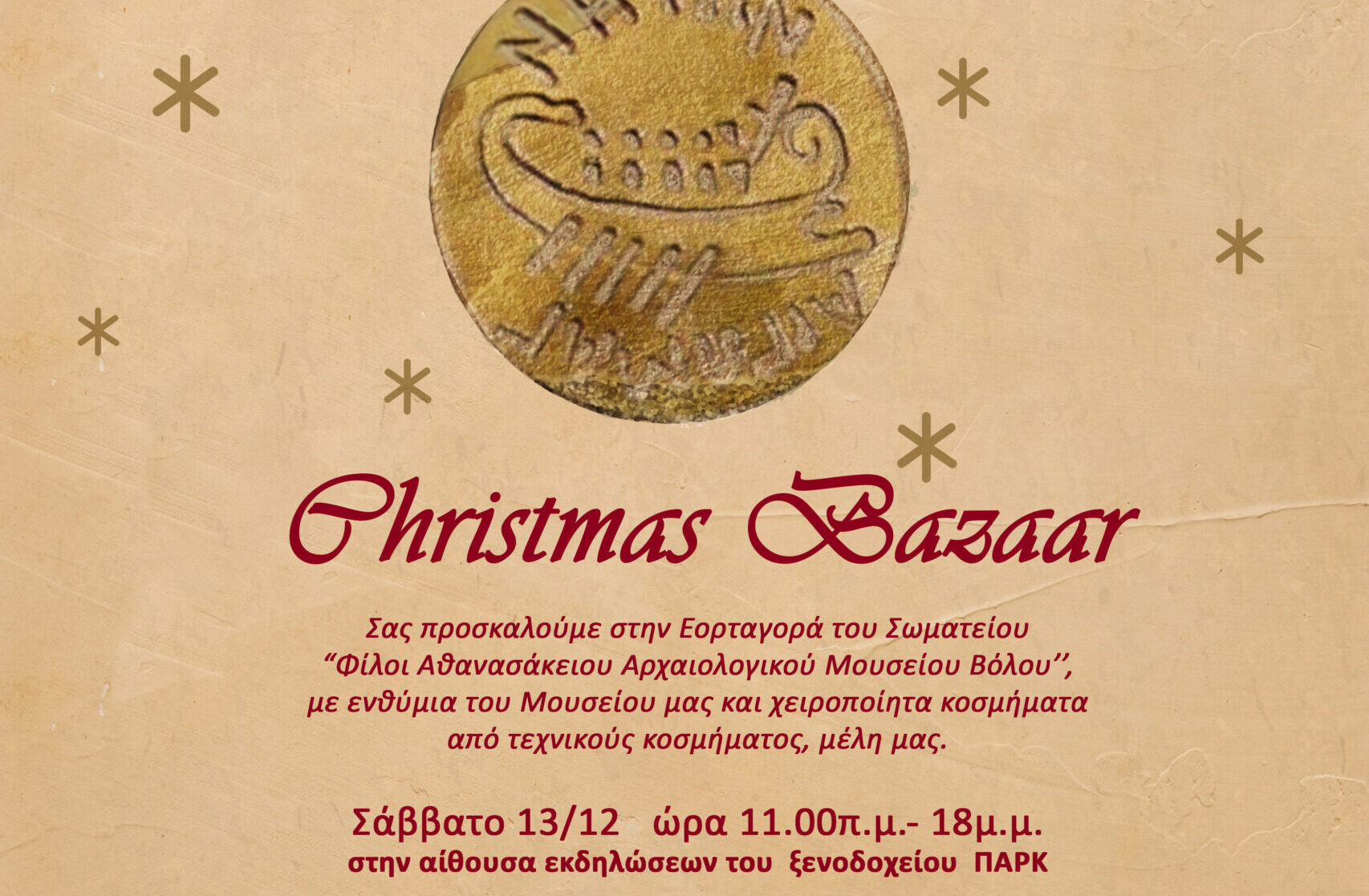 Χριστουγεννιάτικη εορταγορά διοργανώνει το Σωματείο «Φίλοι Αθανασάκειου Αρχαιολογικού Μουσείου Βόλου» το Σάββατο 13 Δεκεμβρίου από τις 11 το πρωί ως τις 6 το απόγευμα στην αίθουσα εκδηλώσεων του ξενοδοχείου ΠΑΡΚ. Στην εορταγορά οι ενδιαφερόμενοι θα βρουν ενθύμια του Μουσείου και χειροποίητα κοσμήματα από τεχνικούς κοσμήματος, μέλη του Σωματείου.
