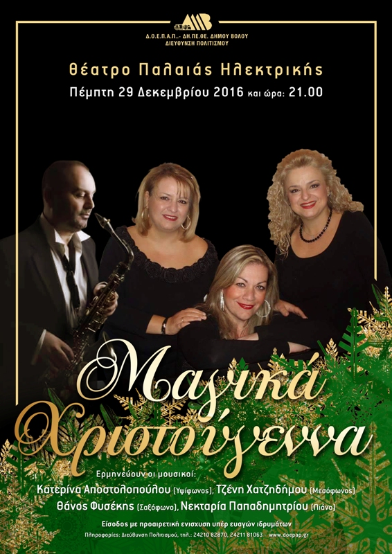 Πρόκειται για μία εορταστική μουσική βραδιά, εναρμονισμένη με τη γιορτινή ατμόσφαιρα των ημερών, στην οποία οι παρευρισκόμενοι θα απολαύσουν ένα πρόγραμμα με χριστουγεννιάτικα τραγούδια του διεθνούς ρεπερτορίου. Απευθύνεται σε ακροατές κάθε ηλικίας. Ανάμεσα στις συνθέσεις που θα ακουστούν περιλαμβάνονται αποσπάσματα από όπερες, negro spirituals, λαϊκά Χριστουγεννιάτικα τραγούδια, το Ave Maria και Amazing Grace αλλά και τα Gingle bell rock και All I want for Christmas is you όπως και πιο σύγχρονα Rock κομμάτια! Στο μουσικό αυτό ταξίδι θα μας συντροφεύσουν τέσσερεις διπλωματούχοι solist με μεγάλη καλλιτεχνική δραστηριότητα. Η Κατερίνα Αποστολοπούλου – Soprano, η Τζένη Χατζηδήμου Μezzo soprano, στο πιάνο συνοδεύει η Νεκταρία Παπαδημητρίου και στο σαξόφωνο ο Θάνος Φυσέκης.