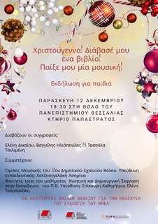 Ο Σύλλογος «ΦΙΛΟΙ ΤΟΥ ΜΟΥΣΕΙΟΥ ΠΑΙΔΙΚΗΣ ΚΑΙ ΕΦΗΒΙΚΗΣ ΛΟΓΟΤΕΧΝΙΑΣ», το Μουσείου Παιδικής & Εφηβικής Λογοτεχνίας(ΜΠΕΛ) και ο Πανελλήνιος Όμιλος Φίλων Αφήγησης(ΠΟΦΑ) σας προσκαλεί σε μια γιορτή για παιδιά ηλικίας 4-12 ετών, την Παρασκευή 12 Δεκεμβρίου στις 18:30 στη Θόλο του Πανεπιστημίου Θεσσαλίας (κτήριο ΠΑΠΑΣΤΡΑΤΟΣ).