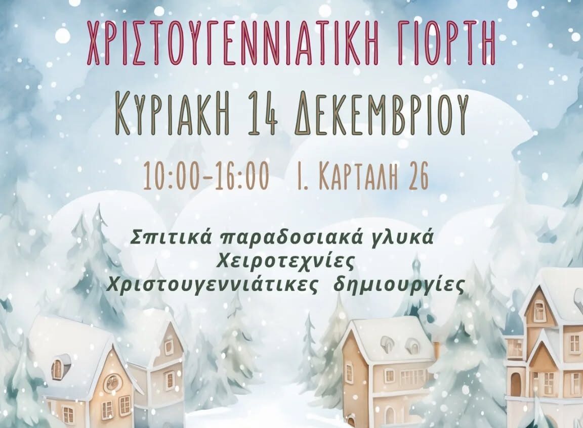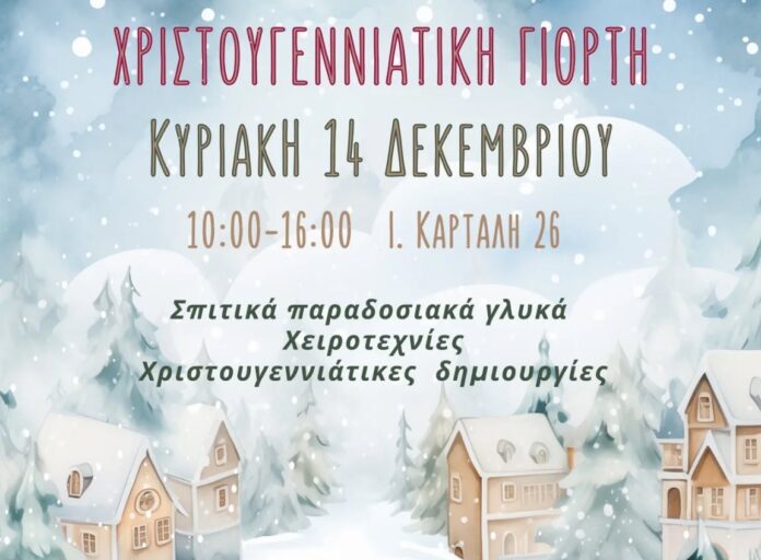 Η Χριστουγεννιάτικη Γιορτή θα γίνει την Κυριακή 14 Δεκεμβρίου 2025, από τις 10:00 π.μ. έως τις 16:00 μ.μ., στην οδό Ι. Καρτάλη 26 στον Βόλο.
