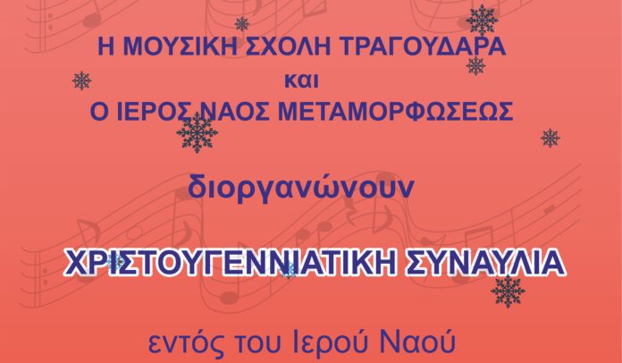 Η Μουσική Σχολή Τραγουδάρα και ο Ιερός Ναός Μεταμορφώσεως διοργανώνουν Χριστουγεννιάτικη Συναυλία εντός του Ιερού Ναού το Σάββατο 17 Δεκεμβρίου και ώρα 18.00 .