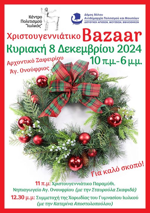 Το Κέντρο Πολιτισμού Ιωλκός , για 11η χρονιά φέτος, διοργανώνει το Χριστουγεννιάτικο Bazaar , την Κυριακή 8 Δεκεμβρίου, από τις 10 π.μ. έως 6 μ.μ. στο πανέμορφο Αρχοντικό Ζαφειρίου , στον Αγ. Ονούφριο.