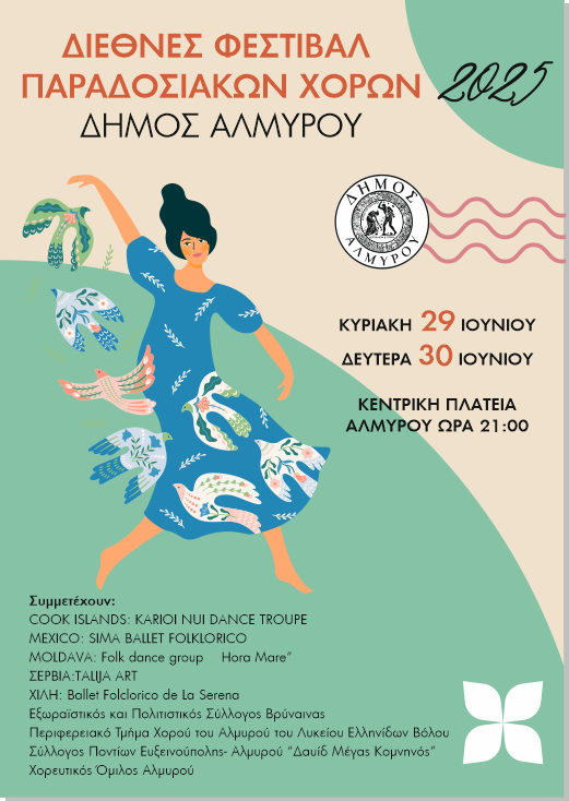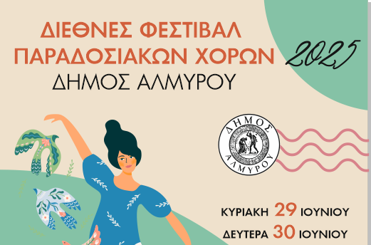 Η Αντιδημαρχία Πολιτισμού και ο Δήμος Αλμυρού διοργανώνουν το Διεθνές Φεστιβάλ Παραδοσιακών Χορών την Κυριακή 29 και Δευτέρα 30 Ιουνίου στην Κεντρική Πλατεία Αλμυρού και ώρα 21:00.