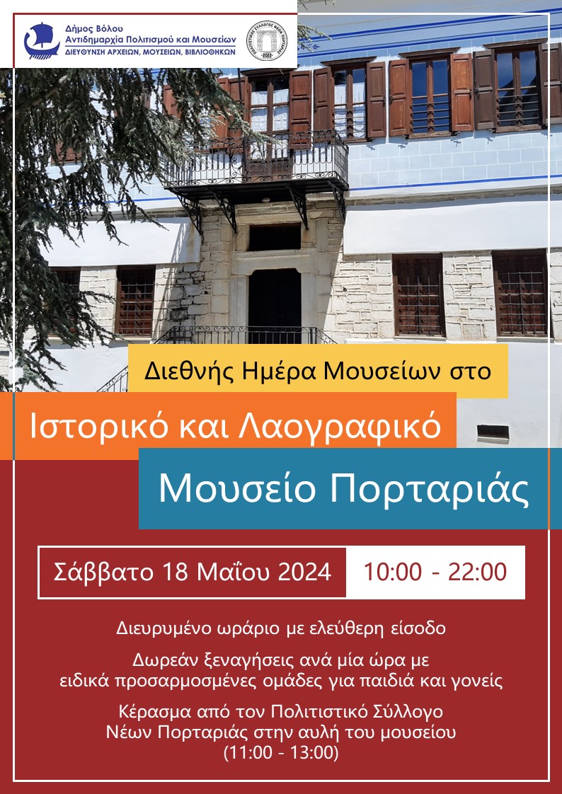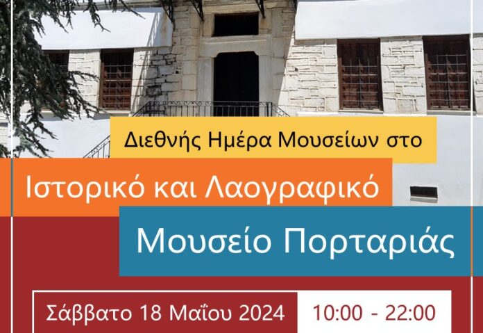 H Διεύθυνση Αρχείων, Μουσείων και Βιβλιοθηκών και ο Πολιτιστικός Σύλλογος Νέων Πορταριάς, με αφορμή το φετινό θέμα του εορτασμού της Διεθνούς Ημέρας Μουσείων, «Μουσεία για την εκπαίδευση και την έρευνα», προσκαλούν όλους να ανακαλύψουν την ιδιαίτερη ιστορία της Πορταριάς, μέσα από τα εκθέματα του Ιστορικού και Λαογραφικού Μουσείου Πορταριάς, το οποίο θα λειτουργήσει το Σάββατο 18 Μαΐου, με διευρυμένο ωράριο και ελεύθερη είσοδο, από τις 10 π.μ. μέχρι και τις 10 μ.μ.