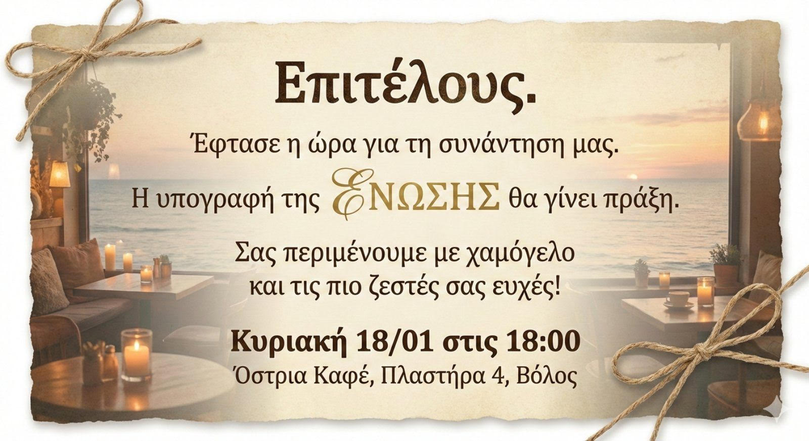 Στη σύσταση συλλόγου προχωρούν οι Αιτωλοακαρνάνες που διαβιούν στον Βόλο και γι’ αυτόν τον λόγο θα πραγματοποιήσουν συνάντηση για να συζητήσουν και να υπογράψουν το καταστατικό τους, την Κυριακή 18 Ιανουαρίου στις 6 το απόγευμα.