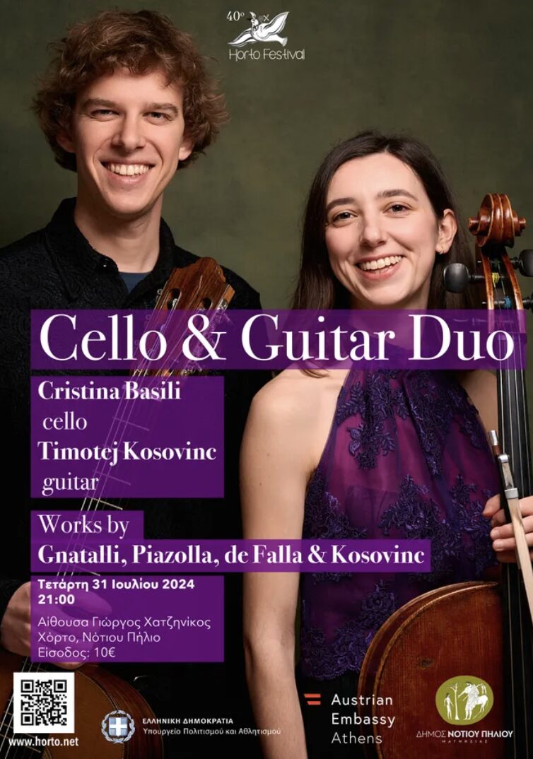 Οι Cristina Basili στο τσέλο και ο Timotej Kosovinc στην κιθάρα, που υποστηρίζονται από το πρόγραμμα εκδηλώσεων της Αυστρικής Πρεσβείας που τα τελευταία καλοκαίρια στηρίζει συναυλίες με καλλιτέχνες από την Ελλάδα και την Αυστρία σε πολλές συναυλίες ανά την Ελλάδα, θα βρεθούν στο Χόρτο σε μια ξεχωριστή μουσική βραδιά.