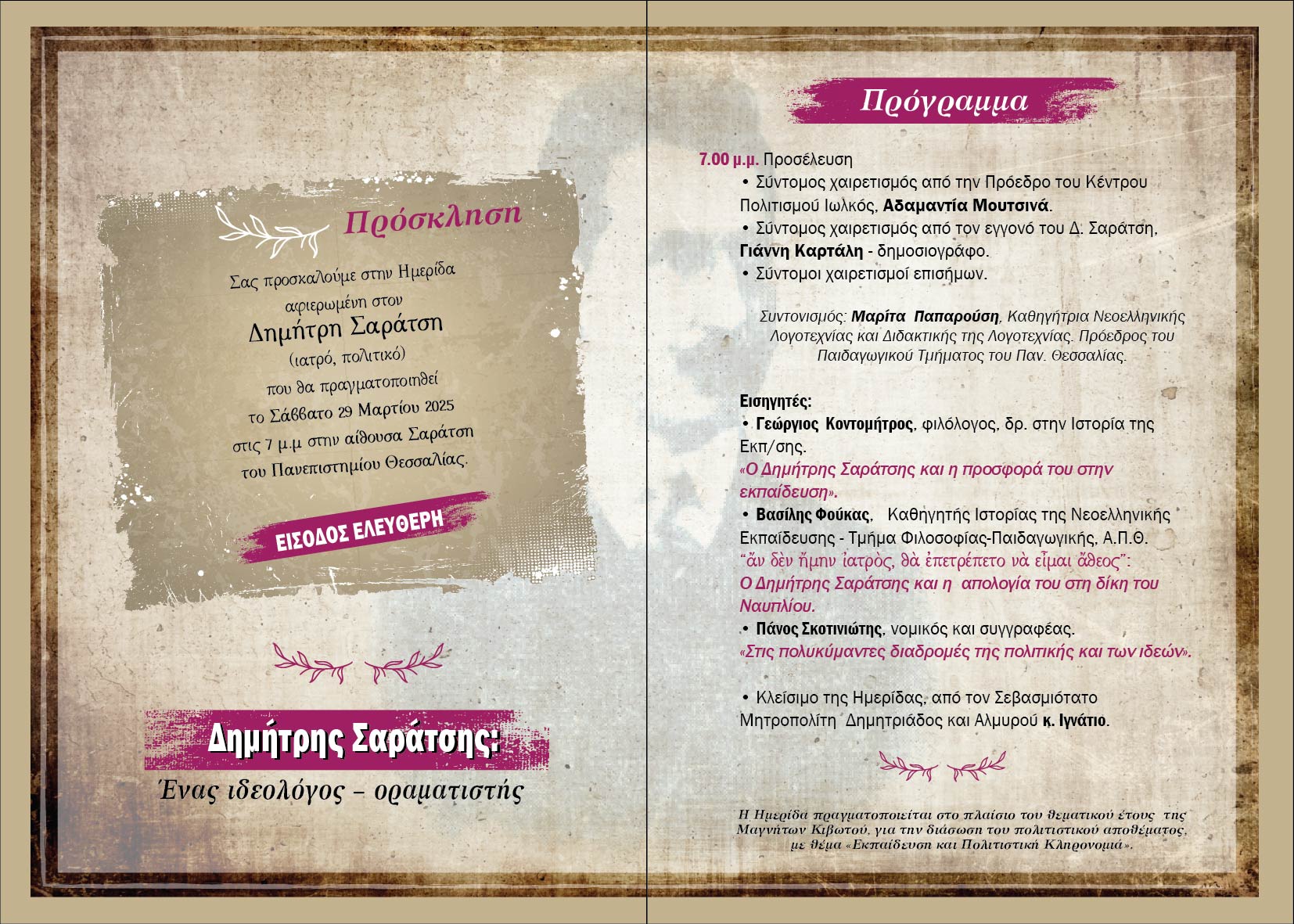 Το Κέντρο Πολισμού Ιωλκός, σε συνεργασία με τον πολιτιστικό φορέα της Ιεράς Μητρόπολης Δημητριάδος «Μαγνήτων Κιβωτό για την διάσωση του πολιτιστικού αποθέματος», το Παιδαγωγικό Τμήμα Δημοτικής Εκπ/σης του Πανεπιστημίου Θεσσαλίας, το Τμήμα Φιλοσοφίας – Παιδαγωγικής, Ιστορικό Αρχείο Νεοελληνικής Εκπ/σης του ΑΠΘ και την Εταιρία Θεσσαλικών Ερευνών, διοργανώνουν ημερίδα για την ζωή και το έργο του Δημήτρη Σαράτση, το Σάββατο 29 Μαρτίου στις 7 μ.μ, στο αμφιθέατρο Σαράτση του Πανεπιστημίου Θεσσαλίας.