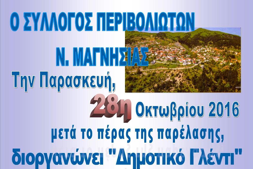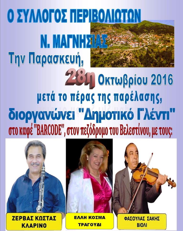 Ο Σύλλογος Περιβολιωτών Ν. Μαγνησίας, την Παρασκευή 28η Οκτωβρίου 2016, μετά το πέρας των επετειακών εκδηλώσεων και της Παρέλασης (μεσημέρι), διοργανώνει ”Δημοτικό Γλέντι”, στο κατάστημα ”BARCODE”, το οποίο βρίσκεται στον κεντρικό πεζόδρομο του Βελεστίνου.