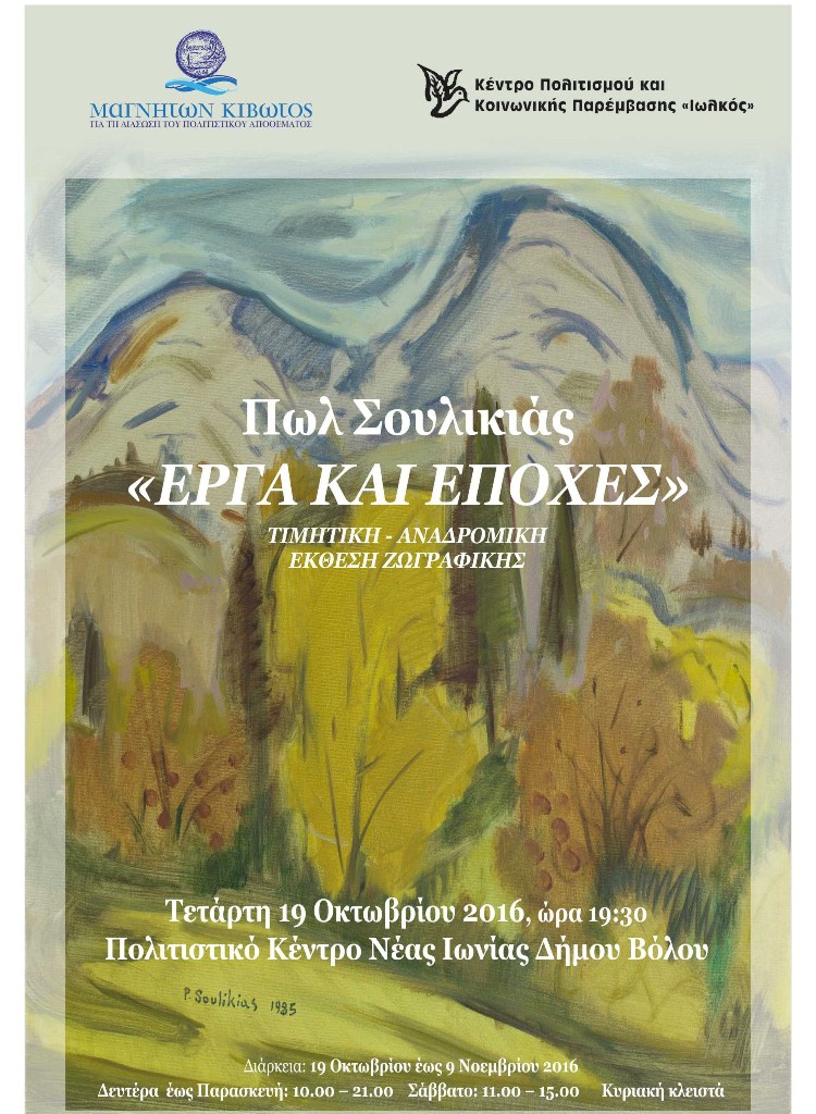 Την Τετάρτη 19 Οκτωβρίου 2016 στις 7:30΄ το απόγευμα στο Πολιτιστικό Κέντρο Νέας Ιωνίας, θα γίνουν τα εγκαίνια της Τιμητικής – Αναδρομικής Έκθεσης Ζωγραφικής, που διοργανώνει ο Φορέας της Ιεράς Μητροπόλεως Δημητριάδος και Αλμυρού, «ΜΑΓΝΗΤΩΝ ΚΙΒΩΤΟΣ – για τη διάσωση του πολιτιστικού αποθέματος», σε συνεργασία με το Κέντρο Πολιτισμού και Κοινωνικής Παρέμβασης «Ιωλκός», προκειμένου να τιμήσουν τον Διεθνή Βολιώτη Εικαστικό Πωλ Σουλικιά.
