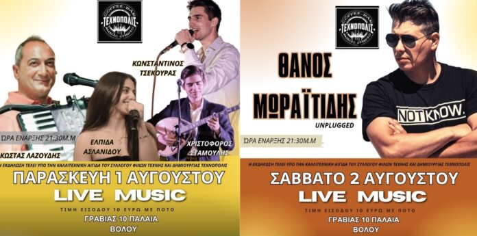 Οι μουσικές βραδιές του Αυγούστου στο Τεχνόπολις αποτελούν μέρος του πολιτιστικού προγράμματος του Συλλόγου Φίλων Τέχνης και Δημιουργίας Τεχνόπολις, που εδώ και χρόνια προωθεί τη ζωντανή τέχνη και στηρίζει ενεργά τη μουσική δημιουργία στον Βόλο. Το πρώτο Σαββατοκύριακο του Αυγούστου, ο πεζόδρομος της Γραβιάς, στα Παλιά γεμίζει ήχους, πρόσωπα, φώτα και καλοκαιρινή ενέργεια, σε ένα διήμερο γεμάτο μουσική, συναίσθημα και αυθεντικές στιγμές.