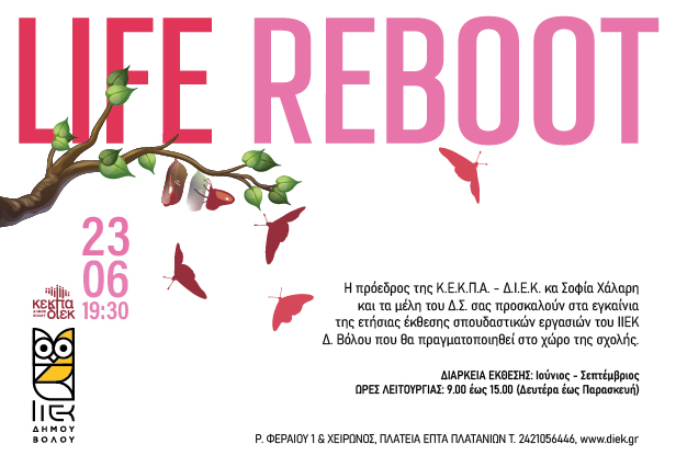 Στα εγκαίνια της ετήσιας έκθεσης σπουδαστικών έργων του ΙΙΕΚ του Δήμου Βόλου με την ονομασία “Life Reboot” μας προσκαλούν η πρόεδρος της Κ.Ε.Κ.Π.Α- Δ.Ι.Ε.Κ. κ. Σοφία Χάλαρη και τα μέλη του Διοικητικού Συμβουλίου, αύριο 23 Ιουνίου στις 19.30 στον χώρο της σχολής.