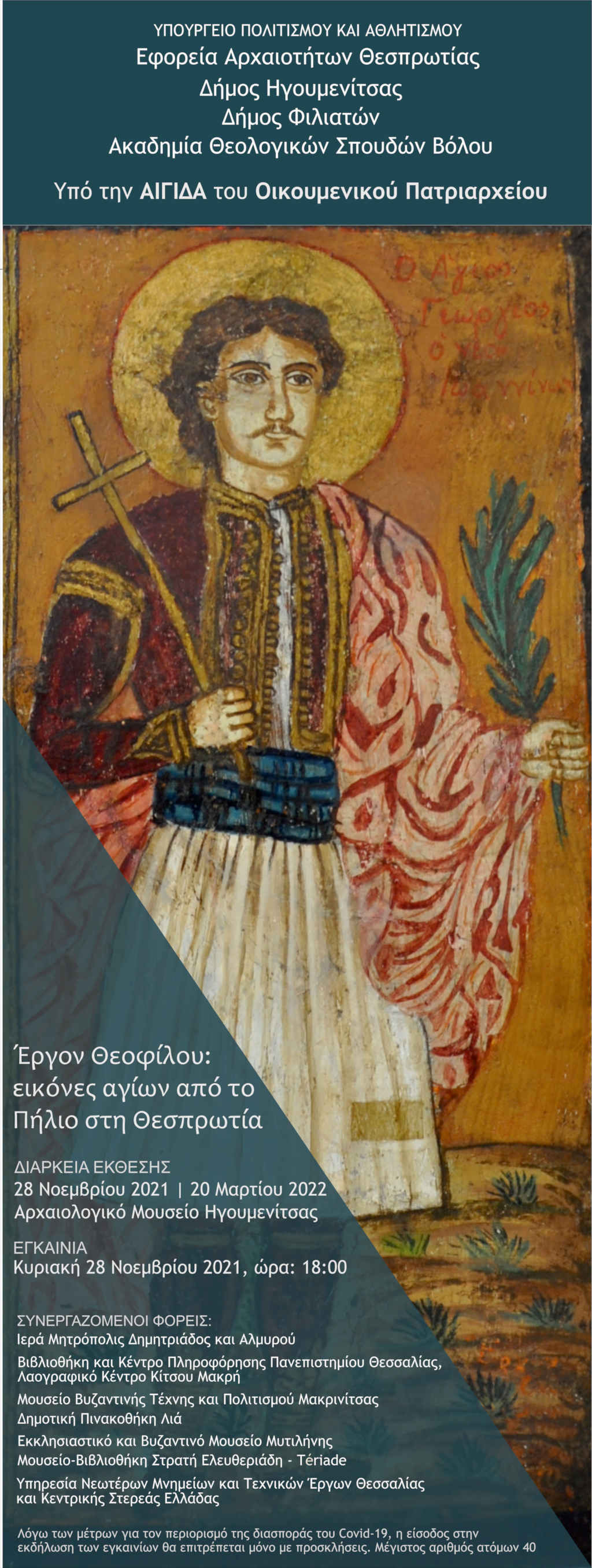 Με εξαιρετική επιτυχία και σε ιδιαίτερα θερμό κλίμα πραγματοποιήθηκαν την Κυριακή 28 Νοεμβρίου 2021 στο Αρχαιολογικό Μουσείο Ηγουμενίτσας τα εγκαίνια της περιοδικής έκθεσης «Έργον Θεοφίλου: εικόνες αγίων από το Πήλιο στη Θεσπρωτία», η οποία τελεί υπό την αιγίδα του Οικουμενικού Πατριαρχείου και διοργανώνεται από την Εφορεία Αρχαιοτήτων Θεσπρωτίας, του Δήμους Ηγουμενίτσας και Φιλιατών και την Ακαδημία Θεολογικών Σπουδών Βόλου, σύμφωνα με σχετικό Δελτίο Τύπου.
