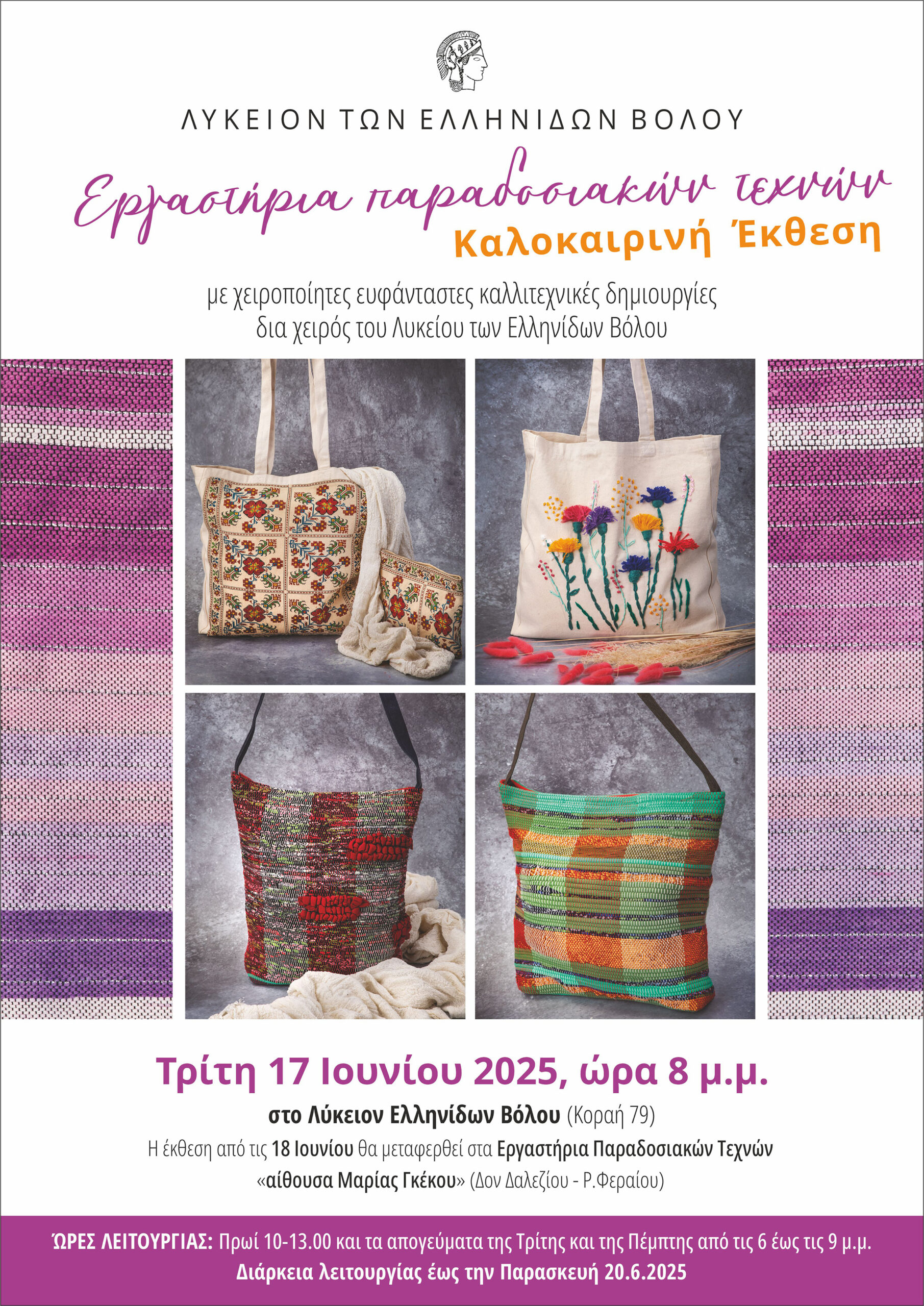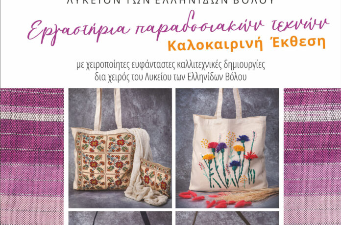 Με την ευκαιρία της λήξης, οργανώνεται μια ενδιαφέρουσα έκθεση, με δημιουργίες γεμάτες χρώματα, σχέδια και φαντασία, άλλες με παραδοσιακά μοτίβα και άλλα με μοντέρνα, που αποτυπώνουν την τέχνη των τεχνών που εξυφαίνονται στα αντίστοιχα εργαστήρια που αναβίωσε και επαναλειτουργεί το Λύκειο των Ελληνίδων Βόλου από το 2008. Έργα δηλαδή που δημιουργήθηκαν στη διάρκεια της τρέχουσας εκπαιδευτικής περιόδου από τους εκπαιδευομένους στα τμήματα υφαντικής, κεντητικής, πλεκτικής και κοπτικής-ραπτικής με την διδασκαλία των εκπαιδευτριών τους Πόπης Αθανασίου, Ράνιας Παπακωνσταντίνου και Λαμπρινής Καραΐσκου.
