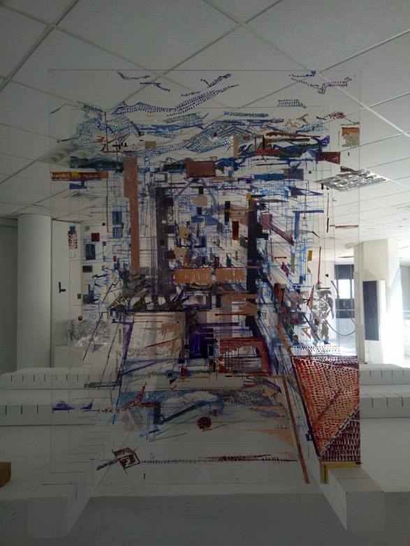 Ο ουτοπικός κόσμος του εικαστικού, που εκτυλίσσεται στο αίθριο του πρώτου ορόφου του μουσείου καταφέρνει να συνδυάσει την κατασκευαστική αντίληψη της φόρμας, με εκείνη της έντονα φορτισμένης συναισθηματικής ζωγραφικής. Σχηματοποιεί τον χώρο του αίθριού, σ΄ ένα παράλληλο ευκλείδειο σύμπαν, δίνοντας την εντύπωση πως πρόκειται για έναν ιδεατό χωρόχρονο δίχως αρχή και τέλος. Έτσι η εικαστική έκθεση διακρίνεται σε τρεις θεματικούς άξονες: Η εξέλιξη της μορφής – Η εξέλιξη του χώρου – Η εξέλιξη της αντίληψης