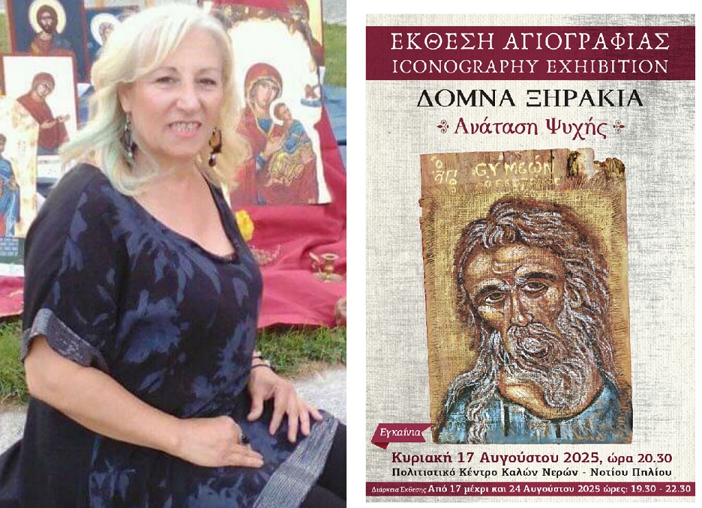 Εγκαίνια της Έκθεσης Αγιογραφίας «Ανάταση Ψυχής» της Δόμνας Ξηρακιά πραγματοποιούνται την Κυριακή 17 Αυγούστου στις 20.30 στο Πολιτιστικό Κέντρο Καλών Νερών – Νοτίου Πηλίου. Η έκθεση που περιλαμβάνει περισσότερα από 50 έργα βυζαντινής αγιογραφίας πάνω σε φυσικά υλικά, αποτελεί μία κατάθεση ψυχής της δημιουργού και θα παραμείνει ανοικτή στο κοινό από 17 έως 24 Αυγούστου 2025, καθημερινά 19:30–22:30.