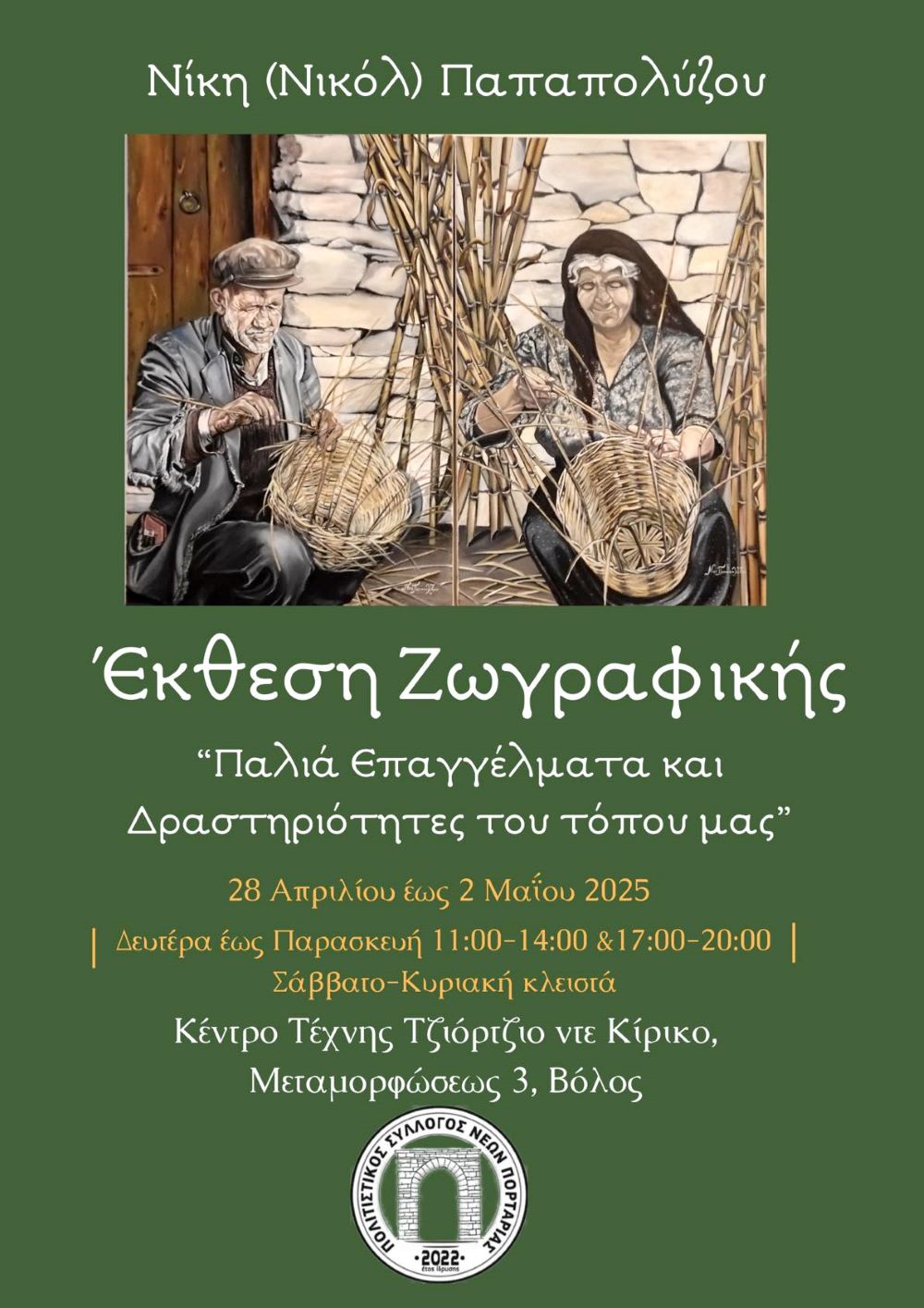 Η έκθεση με τίτλο «Παλιά επαγγέλματα και δραστηριότητες του τόπου μας» της Νίκης Παπαπολύζου, θα εγκαινιαστεί την Δευτέρα 28 Απριλίου, και ώρα 7.00 το απόγευμα, στο Κέντρο Τέχνης Τζιόρτζιο Ντε Κίρικο (Μεταμορφώσεως 3) στον Βόλο.