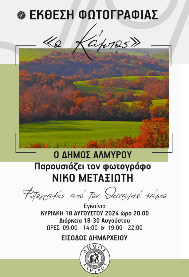 Έκθεση φωτογραφίας του Νίκου Μεταξιώτη με αποτυπώσεις τοπίων του Θεσσαλικού κάμπου θα πραγματοποιηθεί από τις 18 έως και τις 30 Αυγούστου στον Αλμυρό.