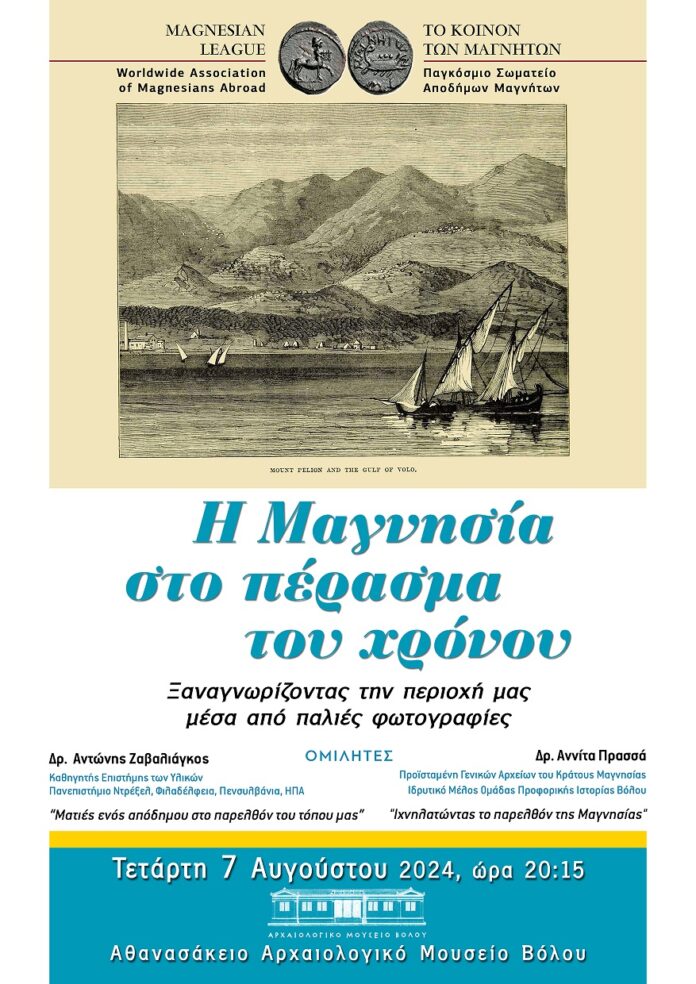 Η “Μαγνησία στο Πέρασμα του Χρόνου” είναι μια σελίδα/ιστολόγιο που εδώ και 12 σχεδόν χρόνια αναβιώνει το παρελθόν του τόπου μας μέσα από παλιές φωτογραφίες, κείμενα και άλλα ντοκουμέντα. Πίσω από αυτή είναι ο Αντώνης Ζαβαλιάγκος, ο οποίος ζει και εργάζεται μόνιμα στη ΗΠΑ από το 1986 και ο οποίος θα παρουσιάσει μια σειρά από φωτογραφικά ντοκουμέντα που θα καλύπτουν την ιστορία της Μαγνησίας, αλλά θα επικεντρωθεί στο ατυχές 1897 που έφερε την πόλη στην διεθνή επικαιρότητα, στη γαλλική δύναμη στον Βόλο (1917), στον ερχομό των προσφύγων στην πόλη, και στις φυσικές καταστροφές της δεκαετίας του 50, καθώς και σε μικρές ανθρώπινες ιστορίες που δίνουν μια άλλη διάσταση σ’ αυτό που συνήθως θεωρούμε σαν «Ιστορία».