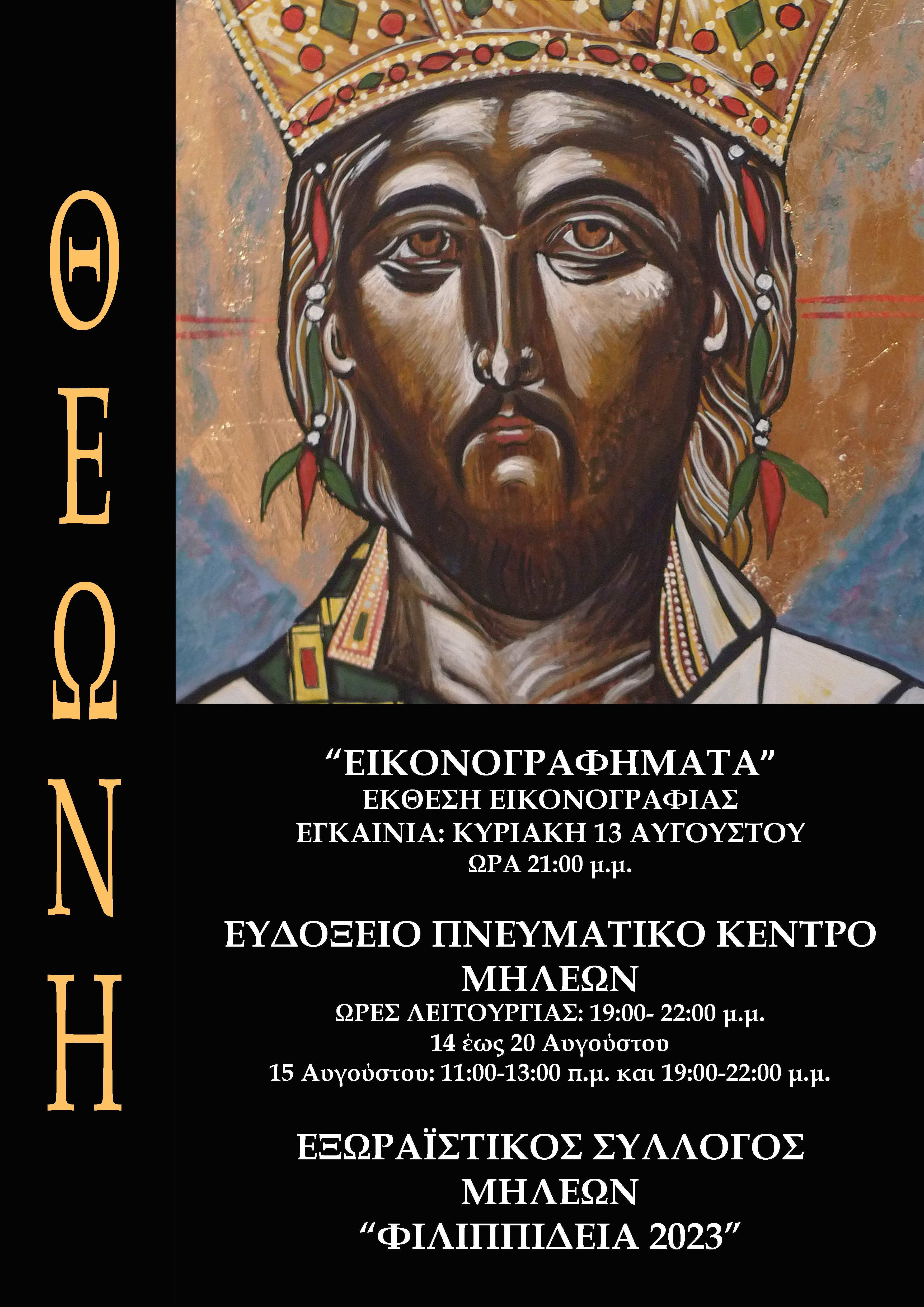 Η έκθεση «Εικονογραφήματα» αποτελεί μέρος του προγράμματος των εκδηλώσεων του Εξωραϊστικού Συλλόγου Μηλεών στο πλαίσιο της διεξαγωγής των «ΦΙΛΙΠΠΙΔΕΙΩΝ 2023» και θα λάβει χώρα στο «Ευδόξιον» Πνευματικό Κέντρο Μηλεών.