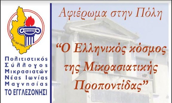 Ο Πολιτιστικός Σύλλογος Μικρασιατών «Το Εγγλεζονήσι» σε συνεργασία με την Δ/νση Πολιτισμού του ΔΟΕΠΑΠ-ΔΗΠΕΘΕ Δήμου Βόλου και την Εταιρία Κοινωνικής Παρέμβασης του Πολιτισμού (ΕΚΠΟΛ) της Περιφέρειας Θεσσαλίας οργανώνει εκδήλωση- αφιέρωμα στη Πόλη με τίτλο «Ο Ελληνικός κόσμος της Μικρασιατικής Προποντίδας» που θα πραγματοποιηθεί το Σάββατο 12 Μαΐου και ώρα 8 το βράδυ στο κλειστό θέατρο του Πολιτιστικού Κέντρου Νέας Ιωνίας.