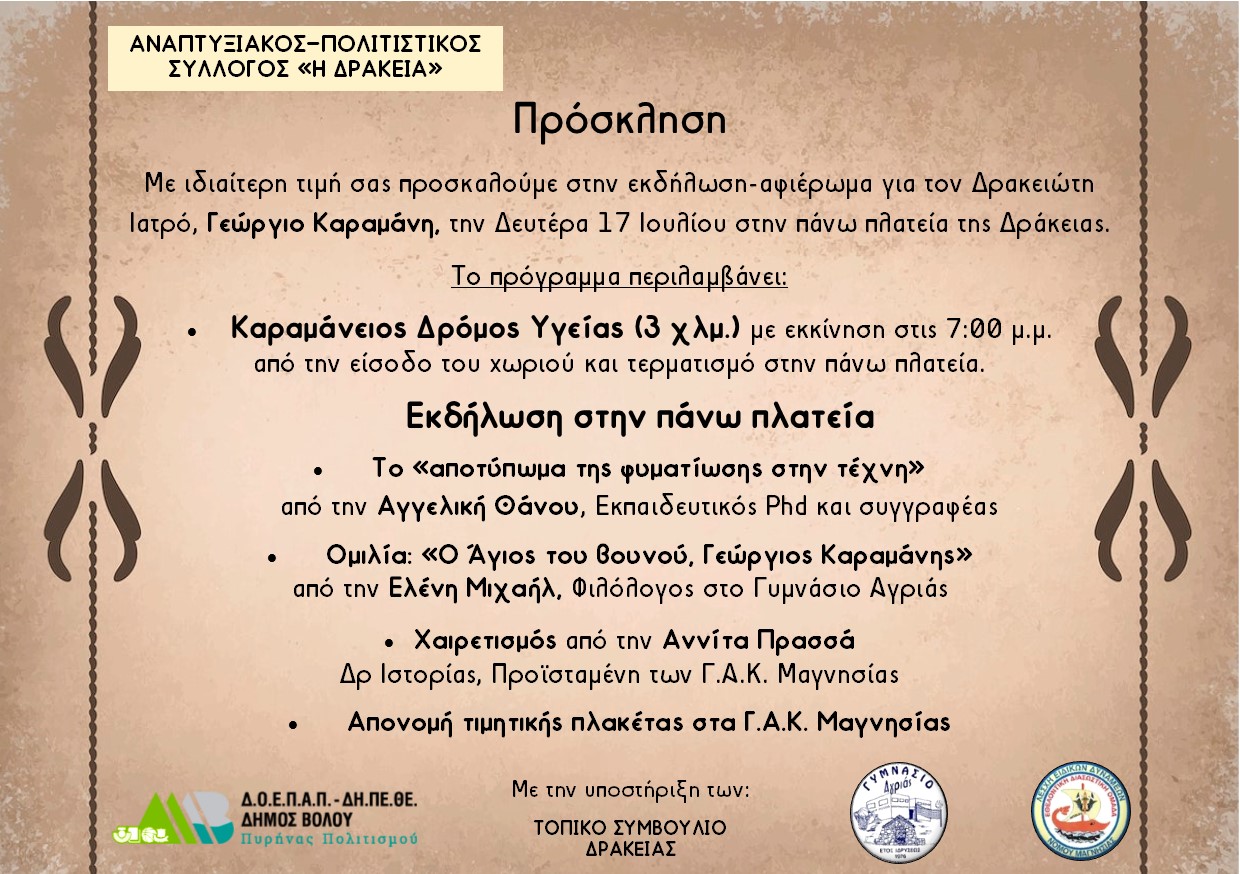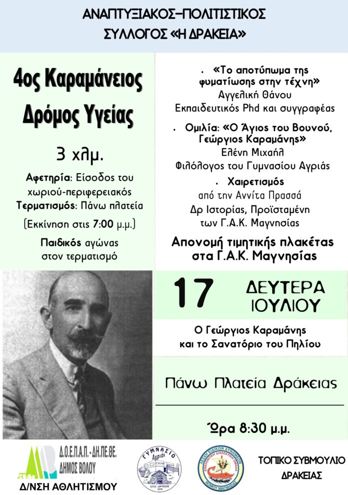 Εκδήλωση-αφιέρωμα στον Δρακειώτη γιατρό Γεώργιο Καραμάνη και στο ιστορικό Σανατόριο του Πηλίου. Συγκεκριμένα σύμφωνα με το πρόγραμμα, θα γίνουν: