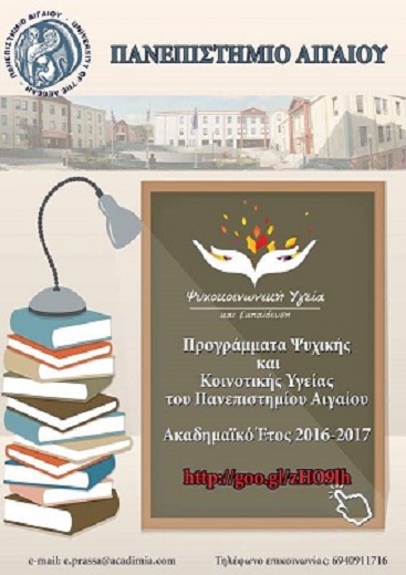 Όπως τονίζεται σε ανακοίνωση, «είναι μία πρωτοβουλία υπό την αιγίδα του Πανεπιστημίου Αιγαίου στο πλαίσιο των Προγραμμάτων Ψυχικής και Κοινοτικής Υγείας και επαγγελματικής κατάρτισης για το Ακαδημαϊκό έτος 2016-2017 που θα βοηθήσουν και θα συντείνουν στην απασχόληση των καταρτιζόμενων».