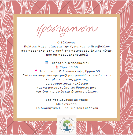 Εκδήλωση για την κοπή της πρωτοχρονιάτικης πίτας του διοργανώνει ο Σύλλογος “Πολίτες Μαγνησίας για την Υγεία και το Περιβάλλον”, την Τετάρτη 5 Φεβρουαρίου 2025, στις 19:30, στο καφέ Φιλίππου (Ερμού 53, Βόλος).