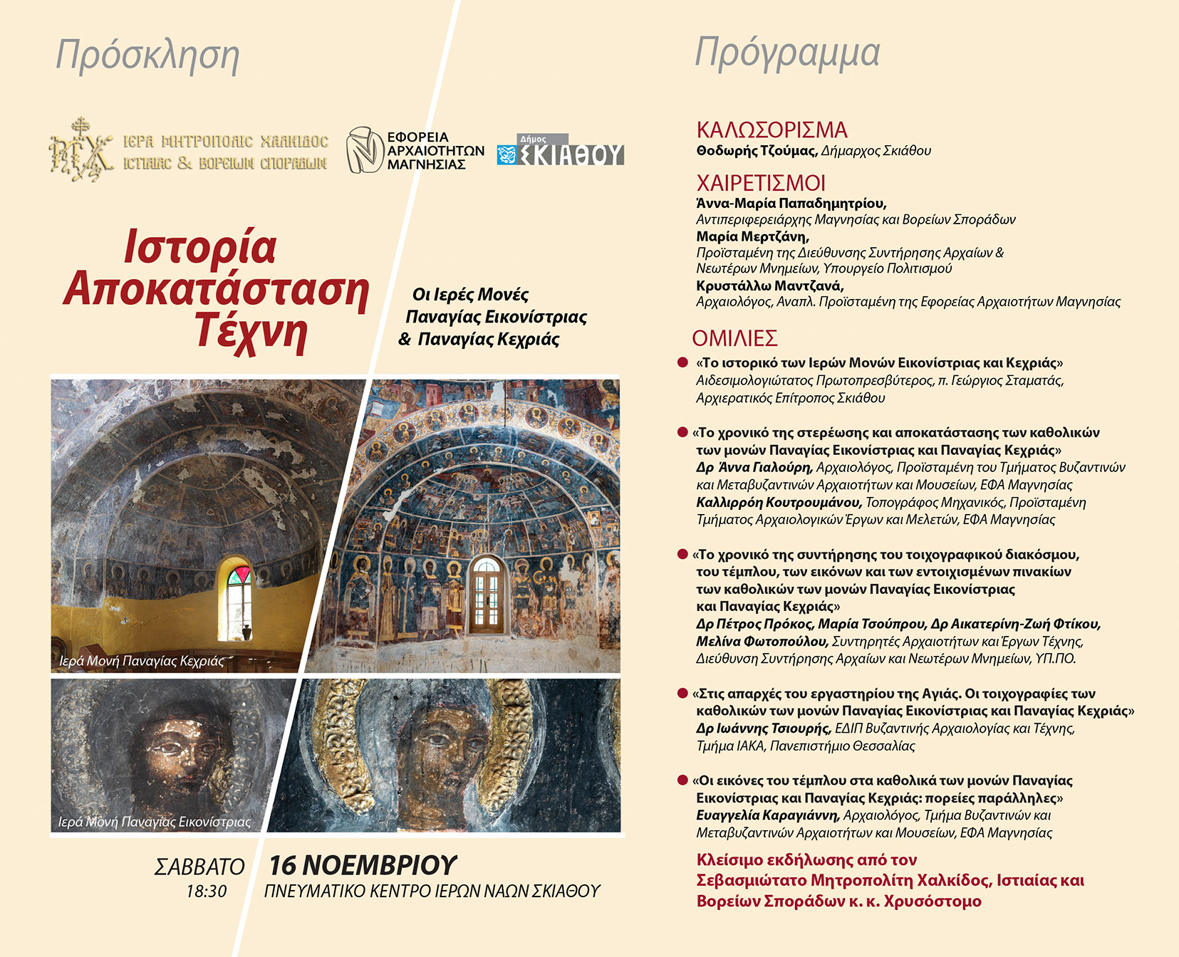 Η Ιερά Μητρόπολη Χαλκίδος, η Εφορεία Αρχαιοτήτων Μαγνησίας και ο Δήμος Σκιάθου διοργανώνουν εκδήλωση με τίτλο «Ιστορία- Αποκατάσταση- Τέχνη: Οι Ιερές Μονές Παναγίας Εικονίστριας και Παναγίας Κεχριάς» το Σάββατο 16 Νοεμβρίου στις 18:30 στο Πνευματικό Κέντρο Ιερών Ναών Σκιάθου.