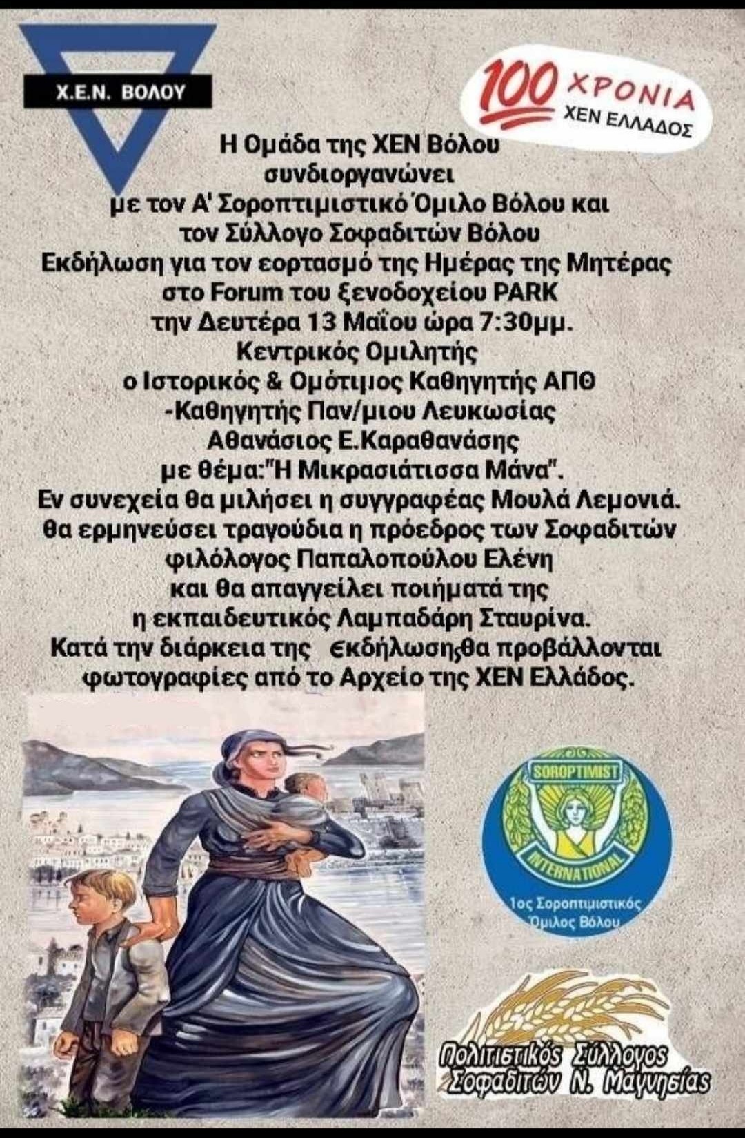 Η Ομάδα της ΧΕΝ Βόλου συνδιοργανώνει με τον Α’ Σοροπτιμιστικό Όμιλο Βόλου και τον Σύλλογο Σοφαδιτών Βόλου εκδήλωση για τον εορτασμό της Ημέρας της Μητέρας στο Forum του ξενοδοχείου Ρark τη Δευτέρα 13 Μαΐου στις 7:30μ.μ..