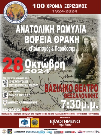 Εκδήλωση του Ιερού Ιδρύματος Ελλήνων Ανατολικής Ρωμυλίας «Η Αγία Τριάδα» θα πραγματοποιηθεί τη Δευτέρα 28 Οκτωβρίου στις 7.30 το απόγευμα στο Βασιλικό Θέατρο Θεσσαλονίκης, με αφορμή τη συμπλήρωση 100 ετών από την οριστική μετεγκατάστασης των Ελλήνων της Ανατολικής Ρωμυλίας- Βόρειας Θράκης.