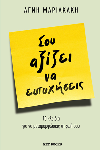 Μπορούν οι φουρτούνες της ζωής να σε κάνουν πιο δυνατό; Μπορεί ο φόβος να σε εξελίξει; Έχεις μάθει να συγχωρείς τον εαυτό σου; Βλέπεις το παρελθόν σαν βάρος ή το έχεις ξεπεράσει; Οι απαντήσεις στα παραπάνω ερωτήματα είναι τα κλειδιά για να αγαπήσουμε τον εαυτό μας – και τη ζωή. Γιατί η αλήθεια είναι πως –αντίθετα με όσα μάς έμαθαν- είμαστε γεννημένοι για να ευτυχούμε», γράφει ο εκδοτικός οίκος «Key Books» για να παρουσιάσει το νέο βιβλίο που εκδίδει με τίτλο «Σου αξίζει να ευτυχήσεις», της Ψυχολόγου Αγνής Μαριακάκη.
