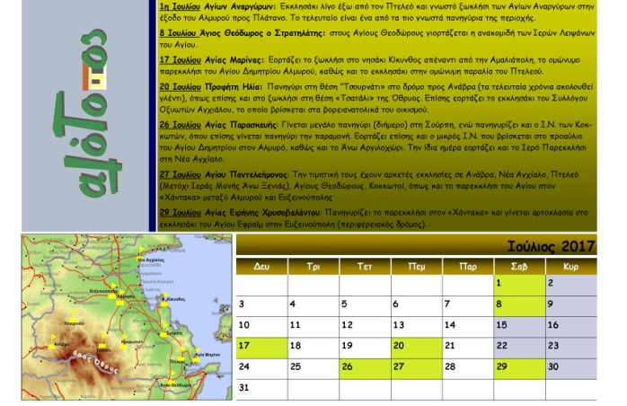 Εκδόθηκε και κυκλοφορεί το Ημερολόγιο του 2017 από την ΚΟΙΝΣΕΠ «ΑΛΟΤΟΠΟΣ» που παρουσιάζει τα 114 θρησκευτικά πανηγύρια που γίνονται στην ευρύτερη περιοχή του Αλμυρού, από το Αχίλλειο μέχρι την Ανάβρα και την Νέα Αγχίαλο. Σε κάθε μηνιαίο φύλλο του ημερολογίου παρουσιάζονται οι βασικές πληροφορίες για τα πανηγύρια της περιοχής καθώς και Χάρτης που δείχνει τη γεωγραφική τους θέση.