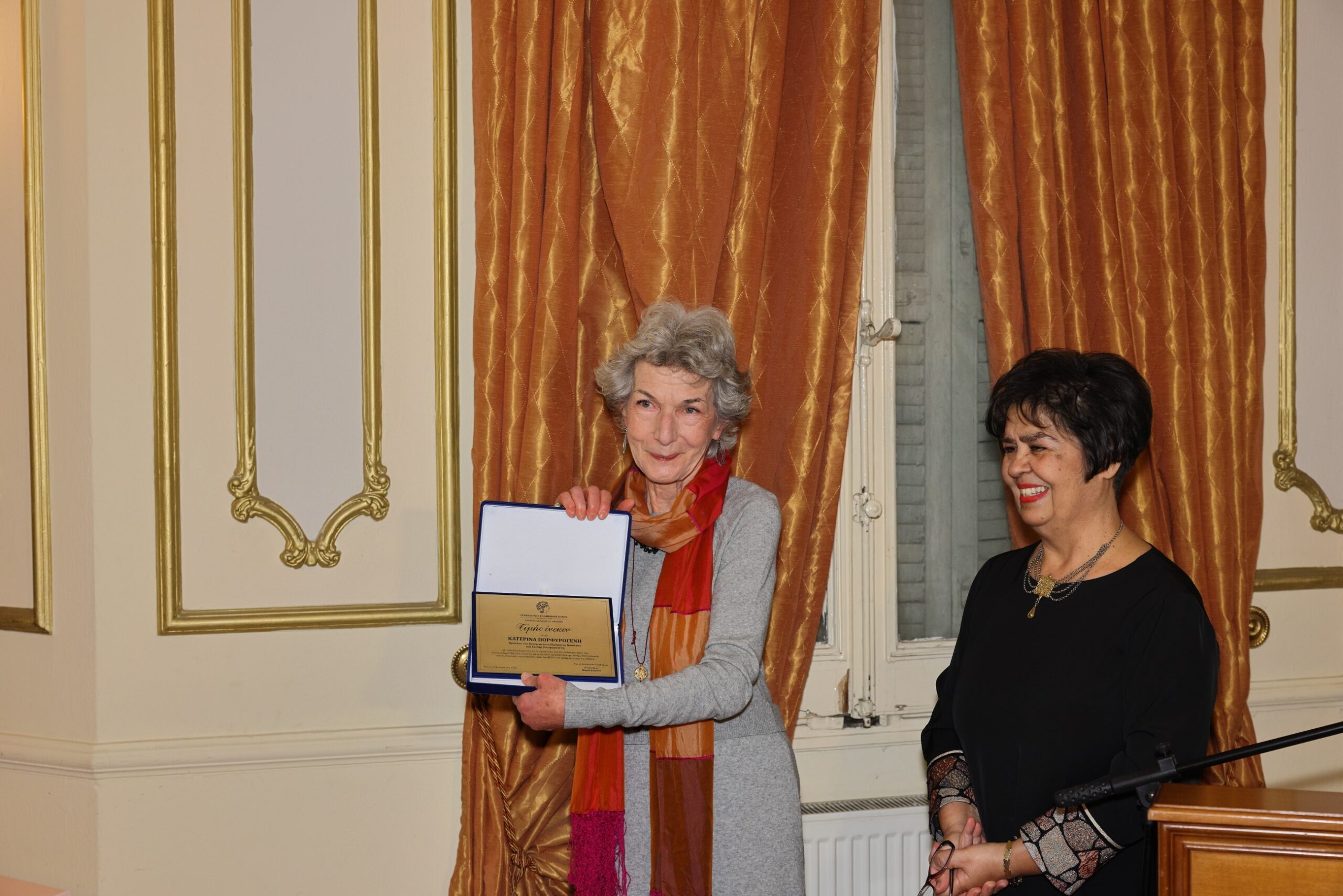 Η Κ. Πορφυρογένη, συνοδευόμενη από το σύζυγό της κ. Francesco Vianello και τον κ. Απόστολο Αποστολάκη, δέχτηκε με πολύ χαρά την απόδοση τιμής στο πρόσωπό της, εκφράζοντας τη συγκίνησή της και ευχαριστώντας θερμά το διοικητικό συμβούλιο του ΛΕΒ, επισημαίνοντας την αξία του εθελοντισμού, της παράδοσης και του πολιτισμού και καταθέτοντας ένα ακριβό προσωπικό της βίωμα σχετικά με την ελληνική χειροτεχνία και την γιαγιά της από τη Δράκεια.