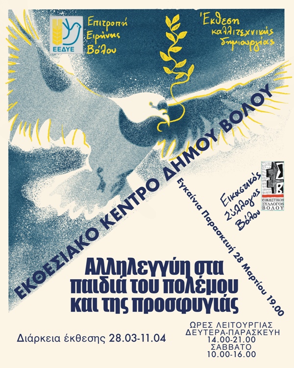 H Επιτροπή Ειρήνης Βόλου με την υποστήριξη του Εικαστικού Συλλόγου Βόλου διοργανώνει για δεύτερη συνεχή χρονιά, έκθεση με κεντρικό θέμα δημιουργίας και έμπνευσης « Αλληλεγγύη τα παιδιά του πολέμου και της προσφυγιάς».