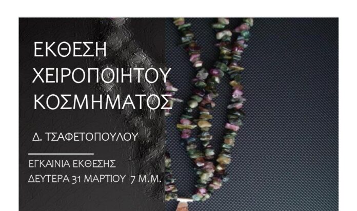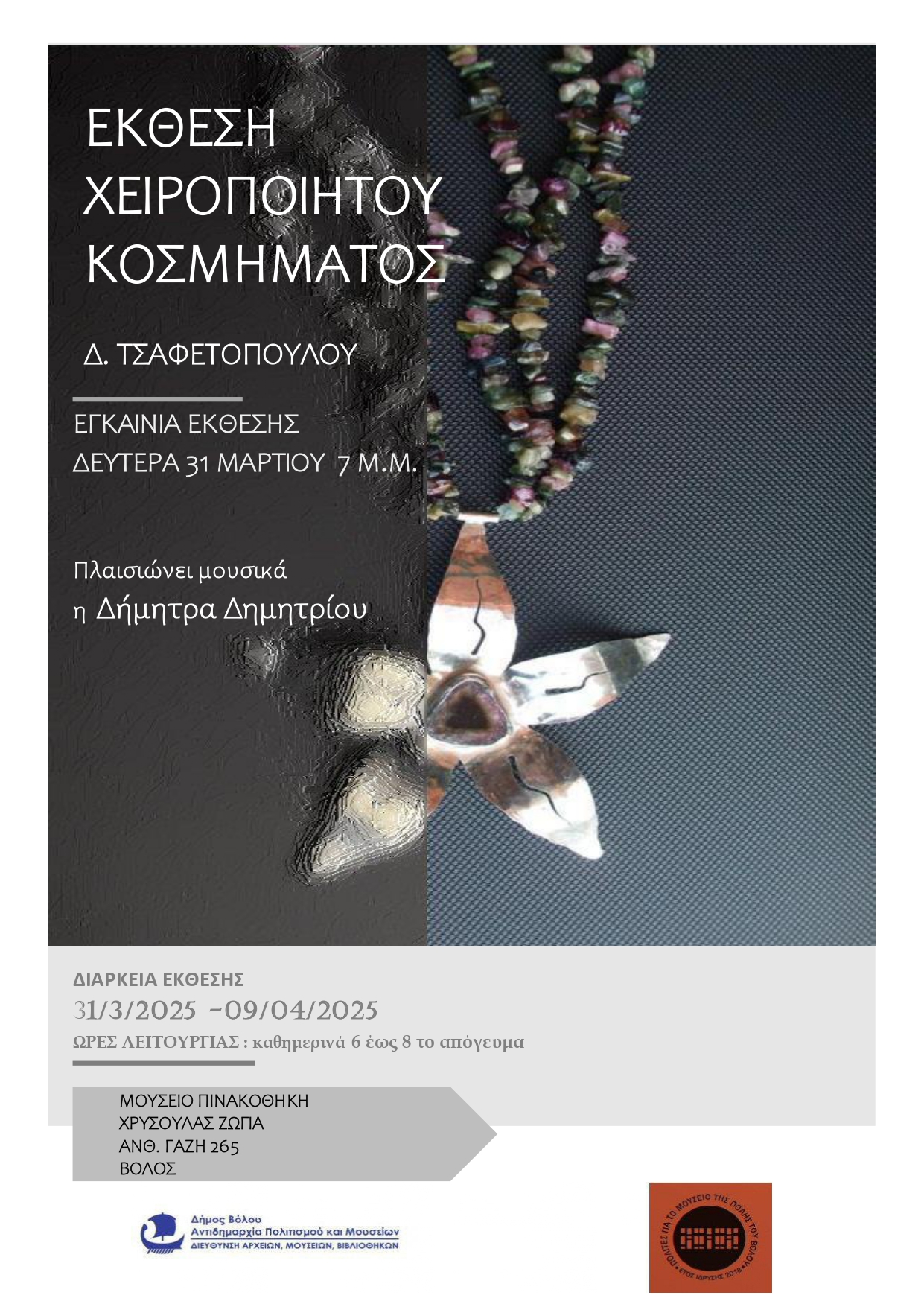 Η Αντιδημαρχία Πολιτισμού & Μουσείων του Δήμου Βόλου, η Διεύθυνση Αρχείων, Μουσείων, Βιβλιοθηκών & “Οι πολίτες για το Μουσείο της πόλης του Βόλου” διοργανώνουν την έκθεσης χειροποίητου κοσμήματος της Δέσποινας Τσαφετοπούλου, με τα εγκαίνια της έκθεσης να πραγματοποιούνται τη Δευτέρα 31 Μαρτίου στις 7 μ.μ. στην Πινακοθήκη- Μουσείο Χρυσούλας Ζώγια, στην οδό Ανθ. Γαζή 265 στον Βόλο.