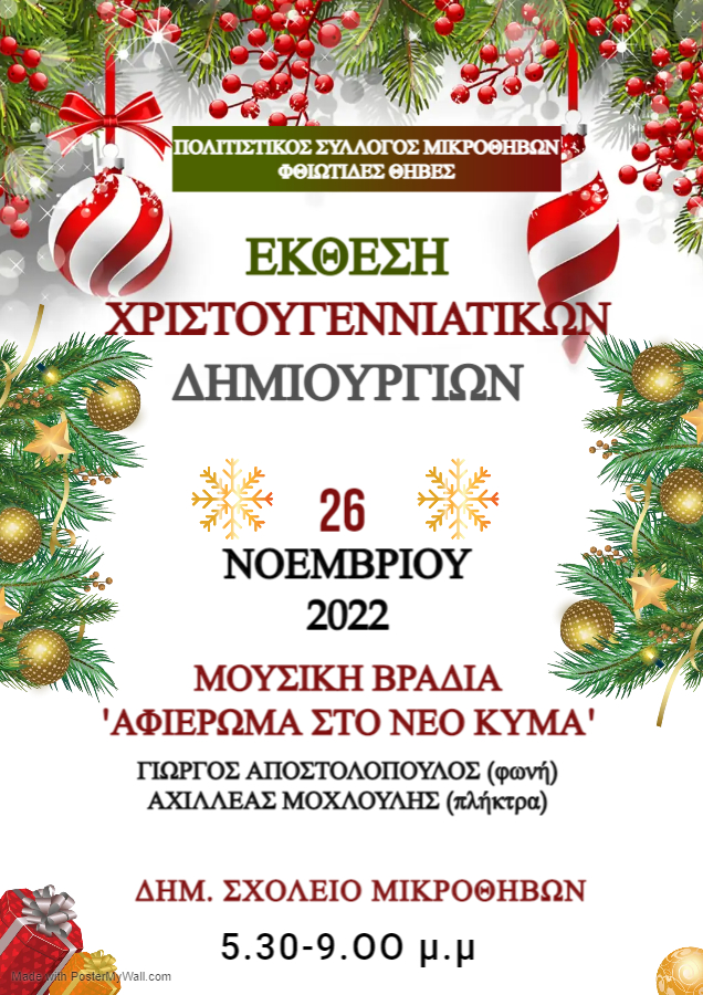 Στα πλαίσια των πολιτιστικών κι εορταστικών εκδηλώσεων για τα Χριστούγεννα 2022, ο Πολιτιστικός Σύλλογος Μικροθηβών «Φθιώτιδες Θήβες» διοργανώνει έκθεση Χριστουγεννιάτικων δημιουργιών, πλαισιωμένη από ζωντανή μουσική στα πλαίσια μουσικής βραδιάς με τίτλο «Αφιέρωμα στο Νέο Κύμα» το Σάββατο 26 Νοεμβρίου 2022, από τις 5.30 έως τις 9.00 μ.μ. στην έδρα του Συλλόγου (πρώην Δημ. Σχολείο Μικροθηβών).