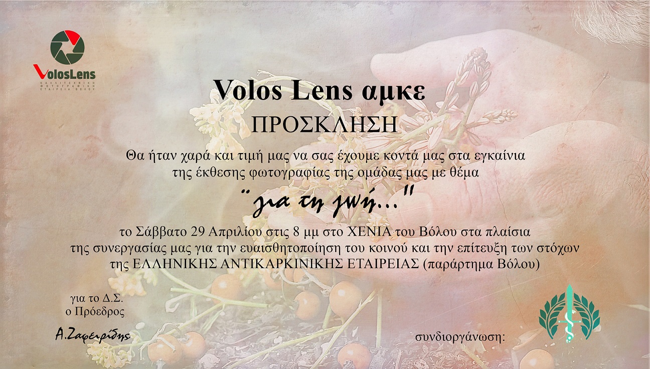 Το παράρτημα Βόλου της Ελληνικής Αντικαρκινικής Εταιρείας πραγματοποιεί το Σάββατο 29/4 και ώρα 8 μμ στο ξενοδοχείο XENIA DOMOTEL εγκαίνια της έκθεσης φωτογραφίας με θέμα “Για τη ζωή “, που συνδιοργανώνει με την ομάδα φωτογραφίας Volos Lens.