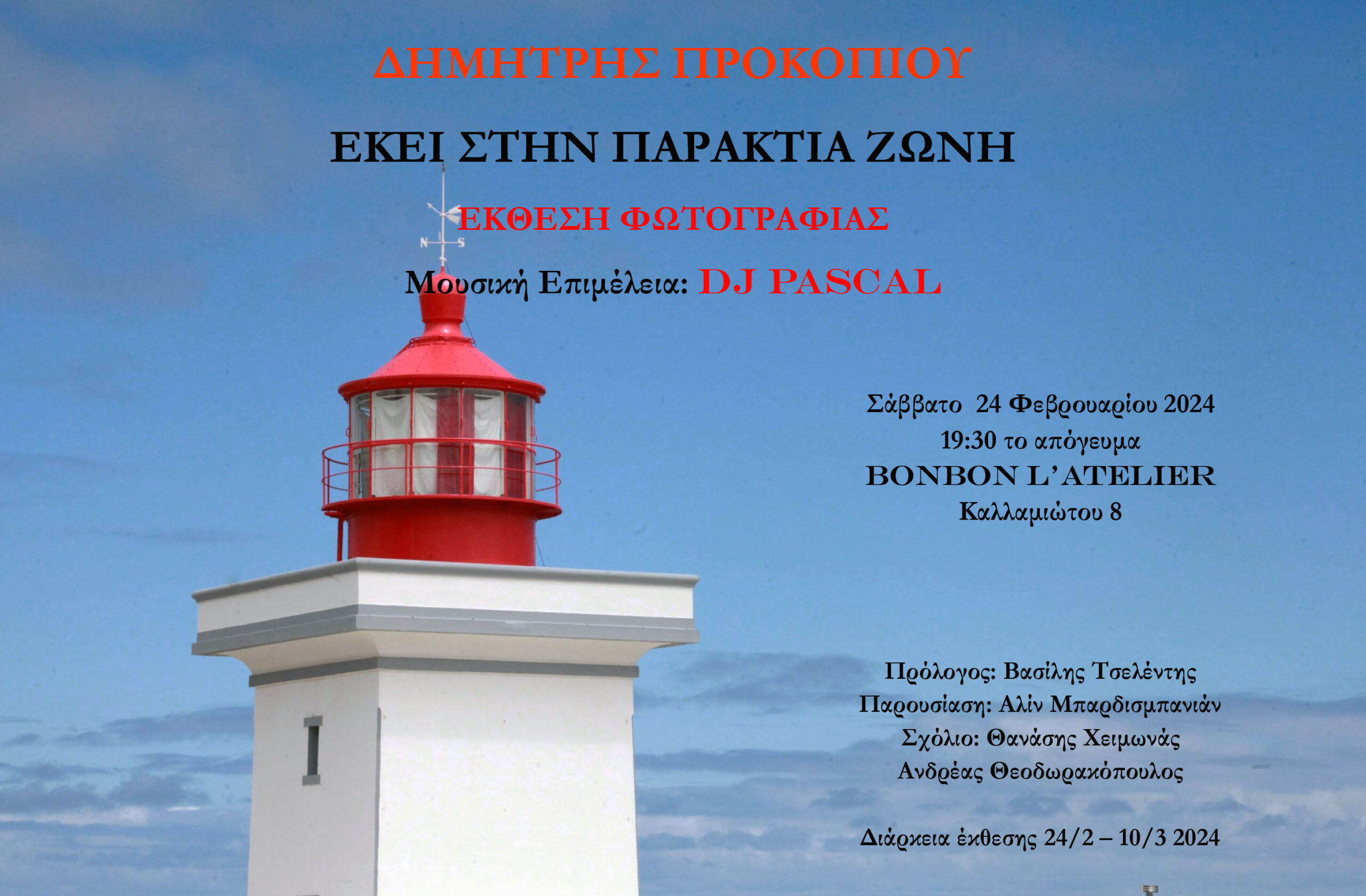 Η έκθεση φωτογραφίας με τίτλο «Εκεί στην παράκτια ζώνη» του Μακρινιτσιώτη Δημήτρη Προκοπίου, αφιερωμένη στη Μάγδα Τσιρογιάννη, φιλοξενείται στο BonBon L΄ Atelier στην Αθήνα από το Σάββατο 24 Φεβρουαρίου έως και τις 10 Μαρτίου.