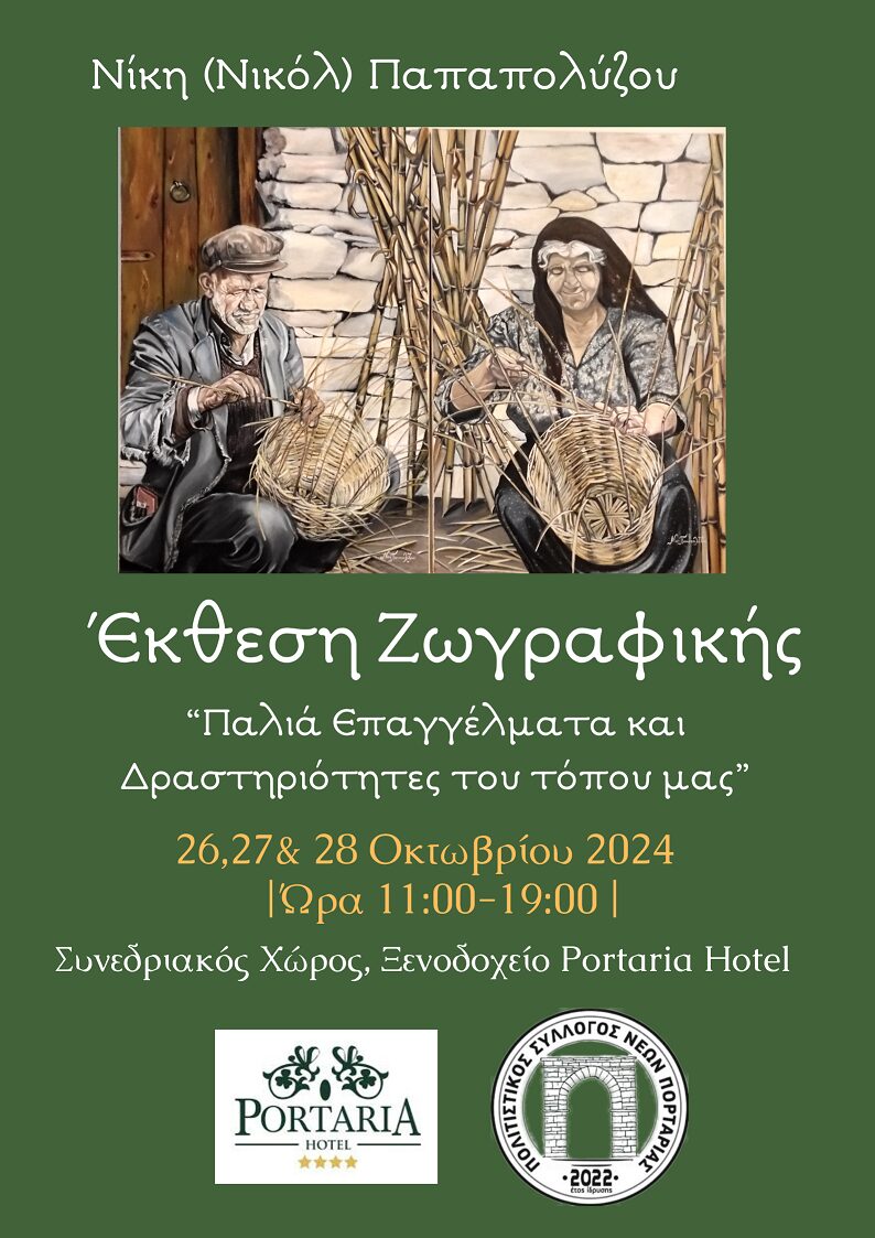 Ο Πολιτιστικός Σύλλογος Νέων διοργανώνει Έκθεση Ζωγραφικής δια χειρός Νίκης (Νικόλ) Παπαπολύζου, το Σάββατο 26, την Κυριακή 27 και την Δευτέρα 28 Οκτωβρίου, από τις 11:00 έως τις 19:00, στον Ξενοδοχείο Πορταριά στην Πορταριά Πηλίου.