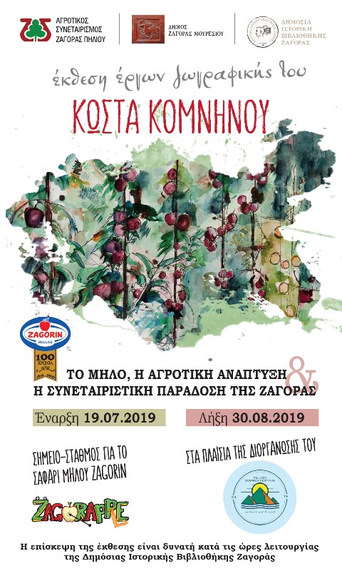 Στα πλαίσια του “Pelion Summer Festival”, μια πρωτοβουλία του Συλλόγου Επαγγελματιών Zαγοράς “Ξένιος Ζευς” αλλά ειδικά με αφορμή τη δράση “ZAGORAPPLE – Σαφάρι Μήλου ZAGORIN” ο Συνεταιρισμός σε συνεργασία με τον Δήμο Ζαγοράς – Μουρεσίου και τη Δημόσια Ιστορική Βιβλιοθήκη Ζαγοράς διοργανώνουν την έκθεση ζωγραφικής “Το μήλο, η αγροτική ανάπτυξη και η συνεταιριστική παράδοση της Ζαγοράς”. Η επιλογή της συνεργασίας είναι ιδιαιτέρως συμβολική καθώς ο Συνεταιρισμός είναι η κινητήριος οικονομική δύναμη όλης της Δημοτικής Ενότητας Ζαγοράς και με τα μήλα που διακινούνται σε όλη την Ελλάδα και το εξωτερικό καθίσταται “πρέσβης” και για την τουριστική ανάπτυξη της περιοχής. Η βιβλιοθήκη στεγάζει την τεράστια ιστορική και πολιτιστική κληρονομία του τόπου, όπου ο Συνεταιρισμός ως φορέας καταχωρημένος στο Εθνικό Ευρετήριο Άυλης Πολιτιστικής Κληρονομιάς, αποτελεί βασικό στοιχείο της. Ο Δήμος Ζαγοράς – Μουρεσίου αποτελεί τη θεσμική δύναμη που αποτελεί επιστέγασμα όλης της ανθρώπινης δραστηριότητας στον τόπο, άλλωστε ο ίδιος ο Δήμαρχος είναι και Πρόεδρος της Δημόσιας Ιστορικής Βιβλιοθήκης Ζαγοράς. Επίσης ο σύλλογος των επαγγελματιών, αποτελείται σε μεγάλο βαθμό από ανθρώπους του τουρισμού οι οποίοι παράλληλα είναι καλλιεργητές και συνέταιροι.