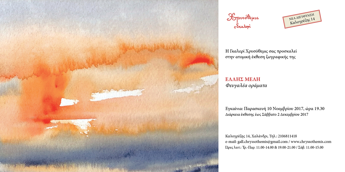 Παρουσιάζεται την Παρασκευή 10 Νοεμβρίου 2017 και ώρα 19.30, στην Γκαλερί Χρυσόθεμις στην Αθήνα, η νέα ατομική έκθεση ζωγραφικής της Έλλης Μέλη από το Πήλιο, «Φευγαλέα οράματα». Θα εκτεθούν έργα μικρών και μεσαίων διαστάσεων. Δουλεμένα με ακουαρέλα, δημιουργούν