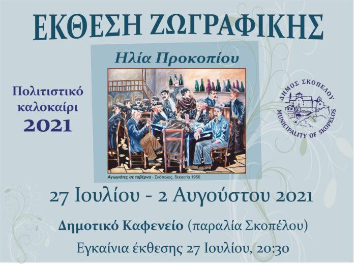 Ο Δήμος Σκοπέλου στα πλαίσια των πολιτιστικών του εκδηλώσεων «ΚΑΛΟΚΑΙΡΙ 2021» διοργανώνει έκθεση ζωγραφικής του κ. Ηλία Προκοπίου, στο Δημοτικό Καφενείο (Παραλία Σκοπέλου), από σήμερα 27 Ιουλίου μέχρι και 2 Αυγούστου 2021. Τα εγκαίνια της Έκθεσης θα γίνουν σήμερα Τρίτη 27 Ιουλίου 2021 και ώρα 20:30. Ώρες λειτουργίας καθημερινά 18:00 – 22:00.