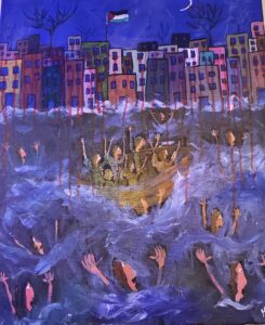Οι πίνακές του μιλούν για τη βία του πολέμου, για τα κορμιά που ξεριζώνονται, για τους ανθρώπους που διαλύονται μέσα στην αδιαφορία. Δεν κραυγάζει φανερά· αφήνει το χρώμα, το σχήμα και τη σιωπή να καταγγείλουν. Η ένταση βρίσκεται εκεί, ανάμεσα στις στρώσεις του χρώματος, στα βλέμματα των μορφών, στις εκρήξεις και τις απουσίες. Είναι μια τέχνη που δεν κανακεύει το βλέμμα· το προκαλεί. Το αναγκάζει να σταθεί.