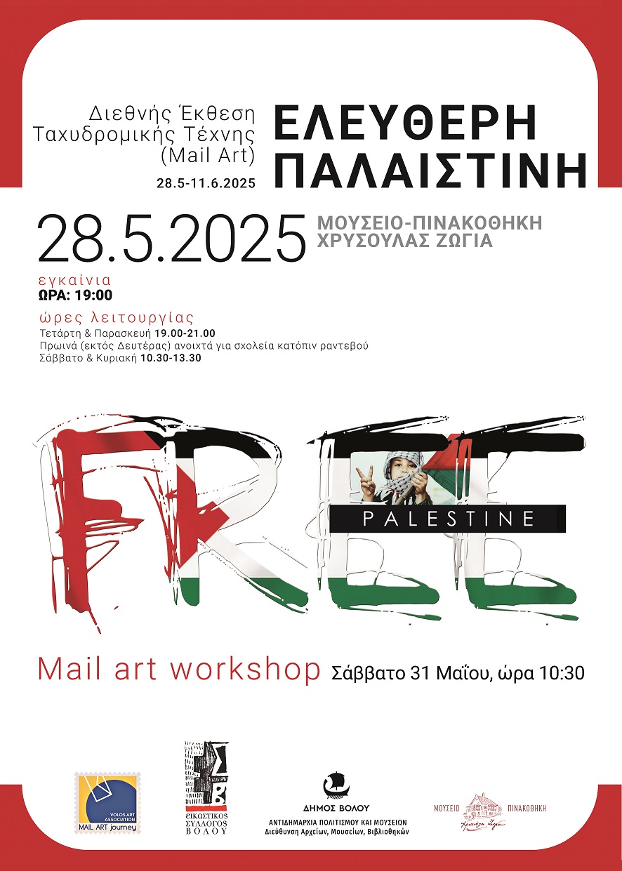 Η ομάδα Mail Art Journey υπό την αιγίδα του Εικαστικού Συλλόγου Βόλου (ΕΣΒ) διοργανώνει διεθνή έκθεση Ταχυδρομικής Τέχνης (Mail Art) με θέμα «Ελεύθερη Παλαιστίνη». Η έκθεση θα λάβει χώρα στο Μουσείο – Πινακοθήκη Χρυσούλας Ζώγια, στην οδό Βλαχάβα με Ανθίμου Γαζή 265 στον Βόλο , και θα διαρκέσει από τις 28 Μαΐου έως 11 Ιουνίου, 2025. Στην έκθεση συμμετέχουν 158 δημιουργοί από 32 χώρες, αποστέλλοντας μικρά έργα (postcards) με ζωγραφική, κολάζ, φωτογραφία και άλλες τεχνικές.