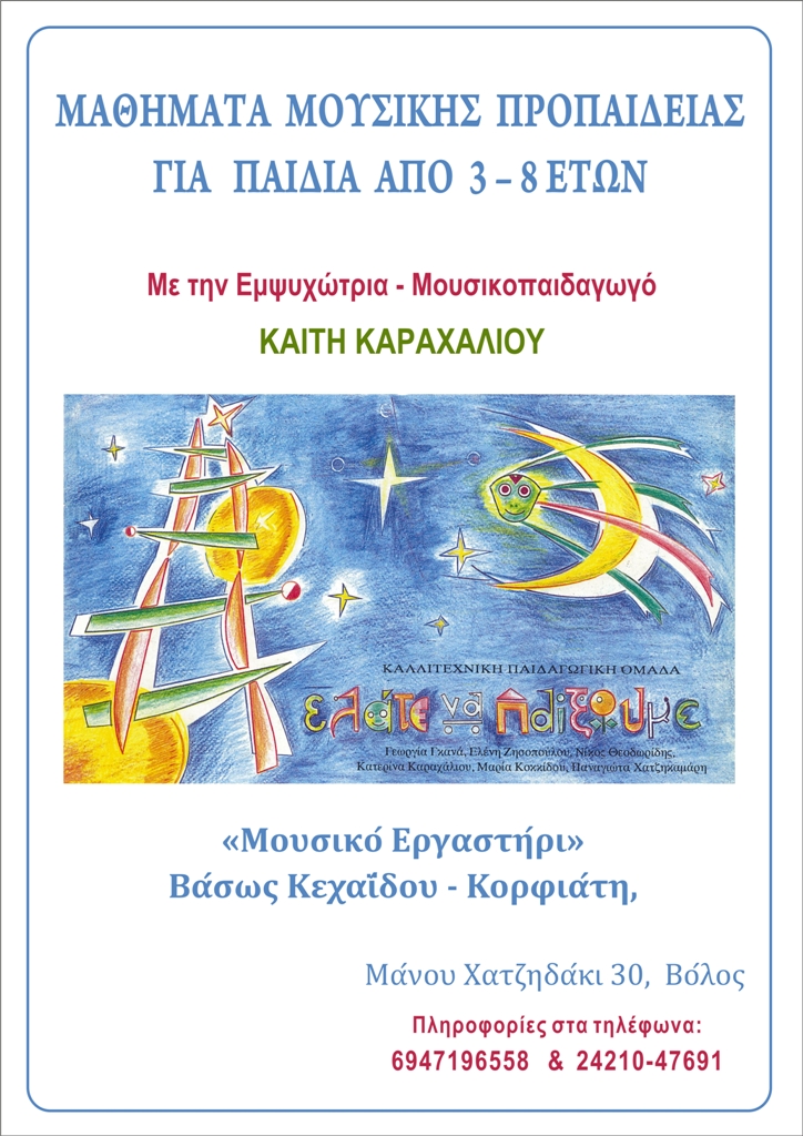 Άρχισαν οι εγγραφές στα τμήματα μουσικής προπαιδείας για ομάδες παιδιών 2 – 8 ετών, του «Ωδείου Βόλου και Ν. Αγχιάλου» της κας Βάσως Κορφιάτη – Κεχαΐδου, με υπεύθυνη διδασκαλίας τη μουσικοπαιδαγωγό Καίτη Καραχάλιου. «ΤΑ ΠΡΟΓΡΑΜΜΑΤΑ ΜΟΥΣΙΚΗΣ ΠΡΟΠΑΙΔΕΙΑΣ» απευθύνονται σε ομάδες παιδιών 2 – 8 ετών, χωρισμένες ηλικιακά και με διαφορετική μουσική προσέγγιση.