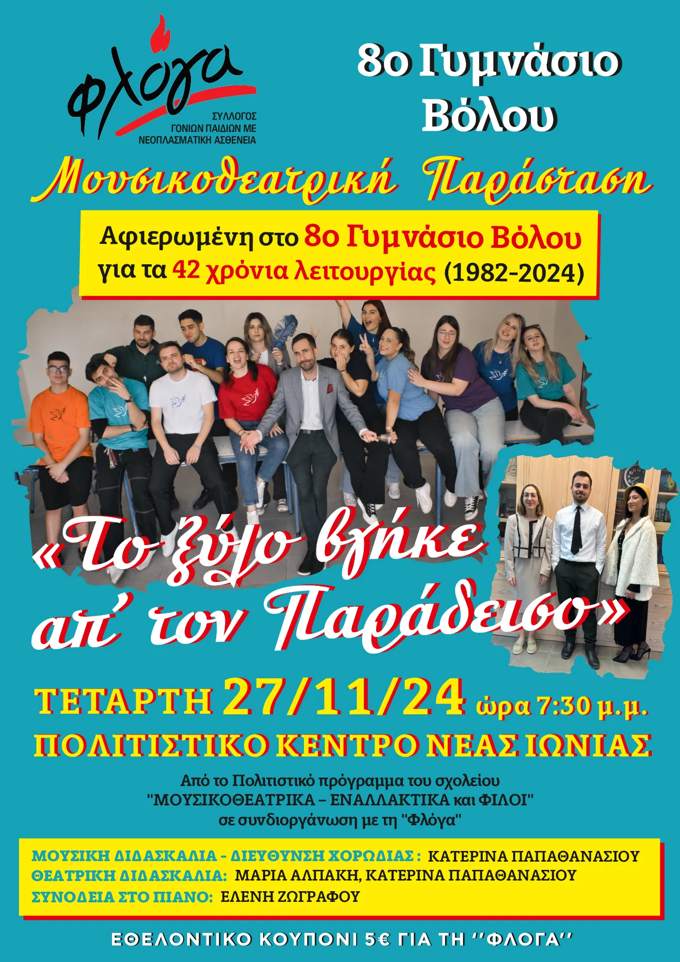 Το καλλιτεχνικό πρόγραμμα «Μουσικοθεατρικά- Εναλλακτικά» όμως, εκτός από το θέαμα, τον πολιτισμό και το σχολείο είχε και ένα κοινωνικό πρόσωπο και όπως είπε η κ. Παπαθανασίου πριν από δέκα χρόνια ξεκίνησε η συνεργασία με τη Φλόγα, η οποία συνεχίζεται, γι’ αυτό και στην παράσταση θα υπάρχει εθελοντικό κουπόνι 5 ευρώ, με τα έσοδα να διατεθούν στην Φλόγα.