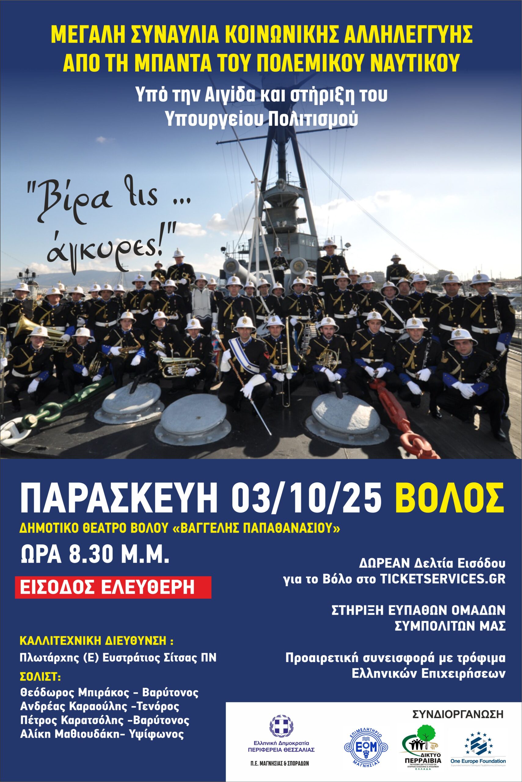 Όλα είναι έτοιμα για τη μαγική βραδιά που θα ζήσει ο Βόλος και με δωρεάν είσοδο, με μια μεγάλη συναυλία κοινωνικής αλληλεγγύης της περίφημης Μπάντας του Πολεμικού Ναυτικού, που θα έρθει στον Βόλο με τους καλύτερους μουσικούς και σολίστες της, την Παρασκευή 3 Οκτωβρίου στις 8 το βράδυ, στο Δημοτικό Θέατρο Βόλου «Βαγγέλης Παπαθανασίου» , σε μια ονειρική συναυλία που έχει τίτλο «Βίρα τις ..άγκυρες!», με τα ομορφότερα τραγούδια της Ελληνικής και παγκόσμιας μουσικής σκηνής.