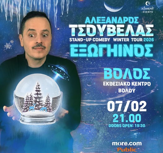 Στον Βόλο θα βρεθεί με την παράσταση «Εξωγήινος» ο Αλέξανδρος Τσουβέλας το Σάββατο 7 Φεβρουαρίου στο Εκθεσιακό Κέντρο στις 9 το βράδυ. Όπως αναφέρεται στη σχετική προαναγγελία: «Ο Αλέξανδρος Τσουβέλας φέρνει μαζί του όλα όσα σκεφτόσουν… αλλά δεν έλεγες ποτέ!
